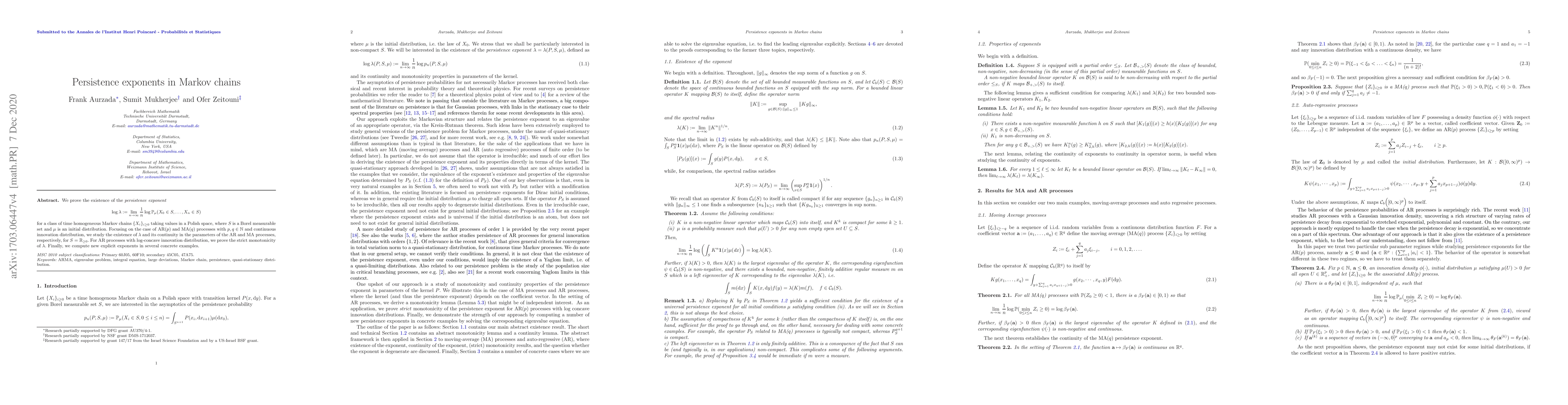 This paper establishes the existence of the persistence exponent for time homogeneous Markov chains on Polish spaces, focusing on AR($p$) and MA($q$) processes. It investigates the continuity of this exponent in the parameters of these processes and proves its strict monotonicity for AR processes with log-concave innovation distributions, alongside computing explicit exponents in specific examples.