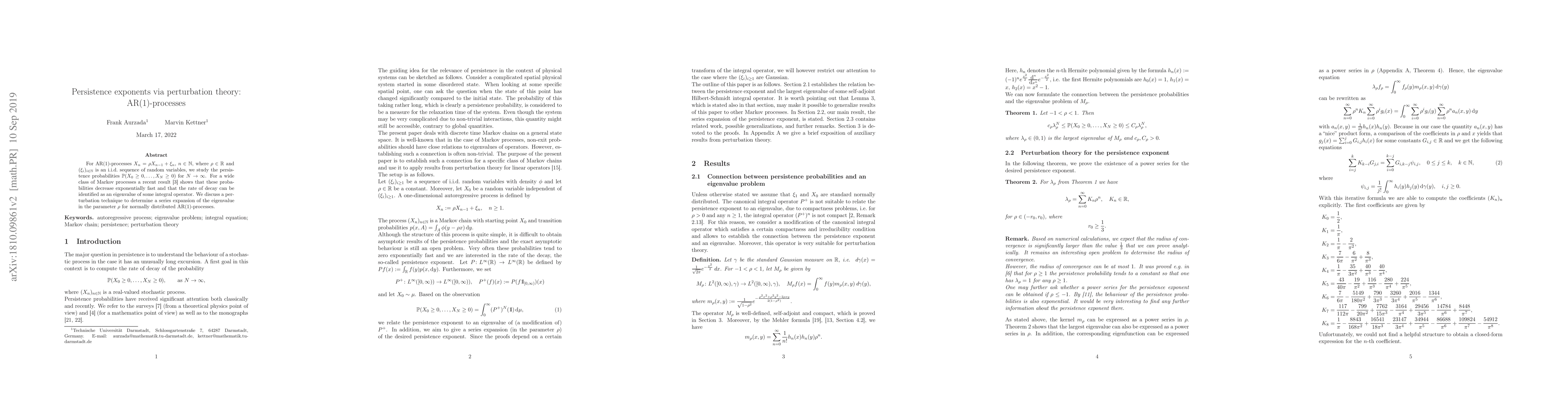 This paper explores the persistence probabilities for AR(1)-processes, showing that they decay exponentially and identifying the decay rate as an eigenvalue of an integral operator. It employs perturbation theory to derive a series expansion for the eigenvalue in the parameter ρ, specifically for normally distributed AR(1)-processes.