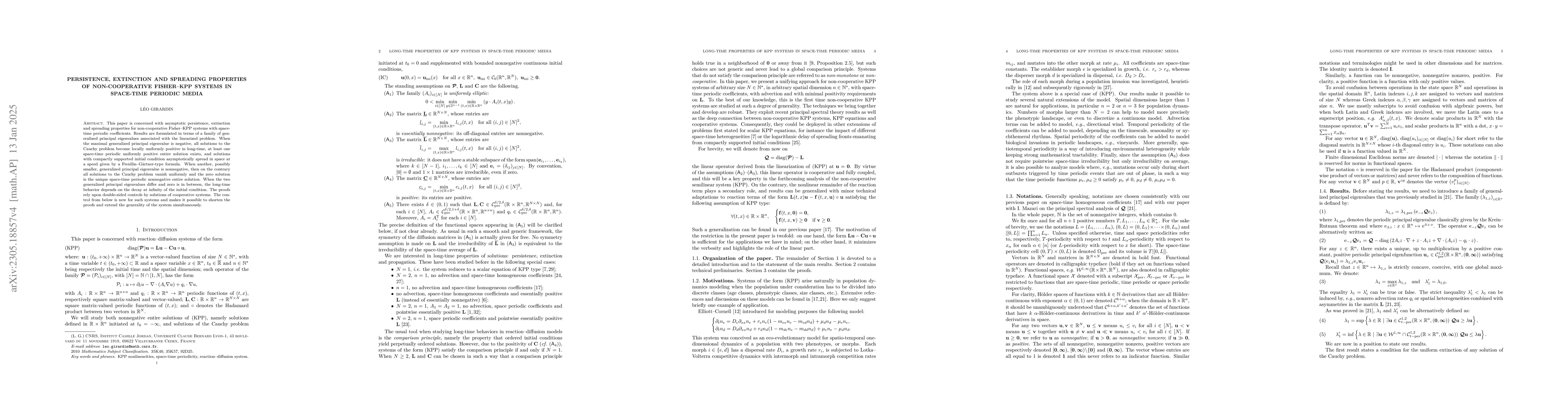 This paper is concerned with asymptotic persistence, extinction and spreading properties for non-cooperative Fisher-KPP systems with space-time periodic coefficients. Results are formulated in terms of a family of generalized principal eigenvalues associated with the linearized problem. When the maximal generalized principal eigenvalue is negative, all solutions to the Cauchy problem become locally uniformly positive in long-time, at least one space-time periodic uniformly positive entire solution exists, and solutions with compactly supported initial condition asymptotically spread in space at a speed given by a Freidlin-G{\"a}rtner-type formula. When another, possibly smaller, generalized principal eigenvalue is nonnegative, then on the contrary all solutions to the Cauchy problem vanish uniformly and the zero solution is the unique space-time periodic nonnegative entire solution. When the twogeneralized principal eigenvalues differ and zero is in between, the long-time behavior depends on the decay at infinity of the initial condition. The proofs rely upon double-sided controls by solutions of cooperative systems. The control from below is new for such systems and makes it possible to shorten the proofs and extend the generality of the system simultaneously.