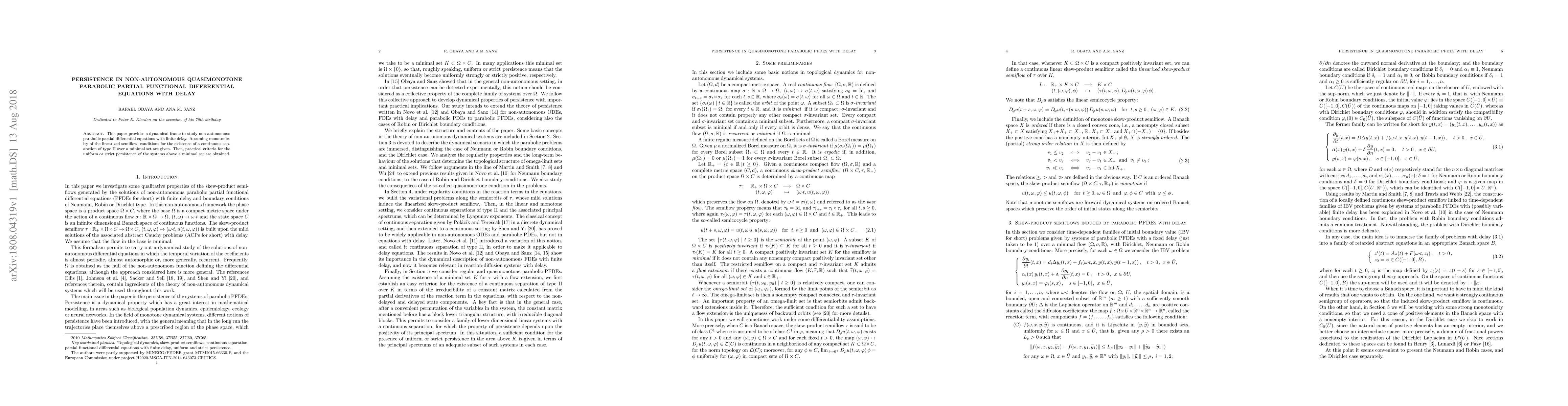 This paper establishes a dynamical framework for non-autonomous quasimonotone parabolic partial functional differential equations with delay, providing conditions for the existence of a continuous separation and criteria for uniform or strict persistence over a minimal set.
