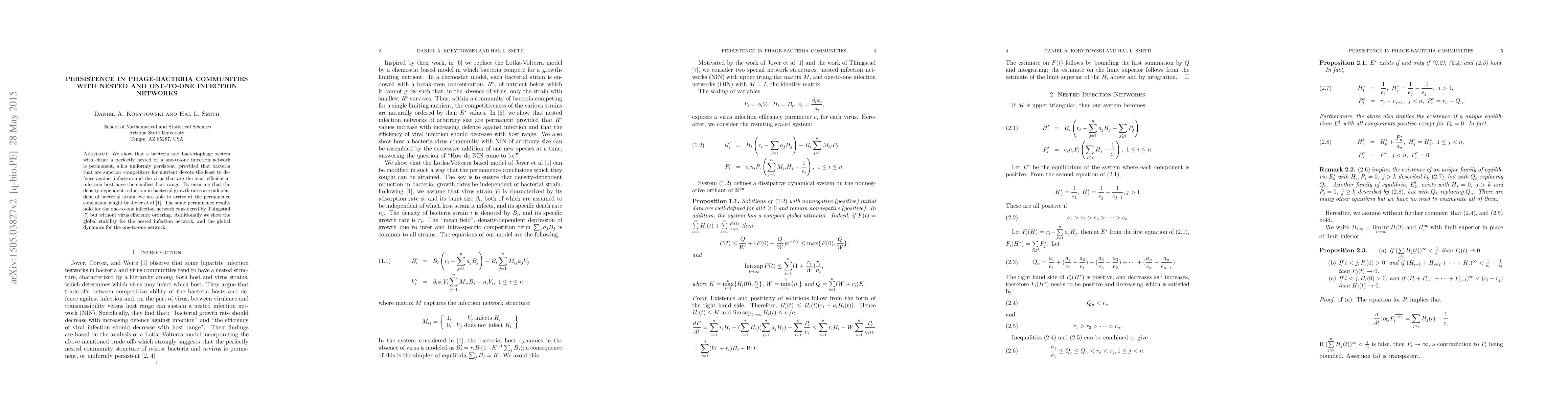 This paper demonstrates the permanence of phage-bacteria systems under nested and one-to-one infection networks, provided certain conditions on bacterial competition and viral efficiency are met. It also proves global stability for the nested network and global dynamics for the one-to-one network.