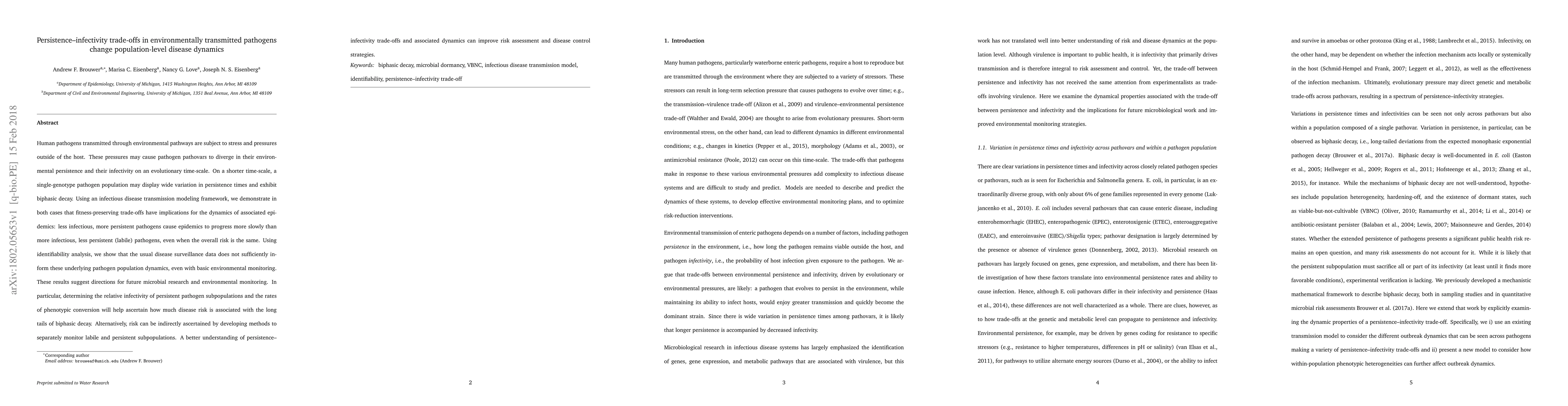 Human pathogens transmitted through environmental pathways are subject to stress and pressures outside of the host. These pressures may cause pathogen pathovars to diverge in their environmental persistence and their infectivity on an evolutionary time-scale. On a shorter time-scale, a single-genotype pathogen population may display wide variation in persistence times and exhibit biphasic decay. Using an infectious disease transmission modeling framework, we demonstrate in both cases that fitness-preserving trade-offs have implications for the dynamics of associated epidemics: less infectious, more persistent pathogens cause epidemics to progress more slowly than more infectious, less persistent (labile) pathogens, even when the overall risk is the same. Using identifiability analysis, we show that the usual disease surveillance data does not sufficiently inform these underlying pathogen population dynamics, even with basic environmental monitoring. These results suggest directions for future microbial research and environmental monitoring. In particular, determining the relative infectivity of persistent pathogen subpopulations and the rates of phenotypic conversion will help ascertain how much disease risk is associated with the long tails of biphasic decay. Alternatively, risk can be indirectly ascertained by developing methods to separately monitor labile and persistent subpopulations. A better understanding of persistence--infectivity trade-offs and associated dynamics can improve risk assessment and disease control strategies.