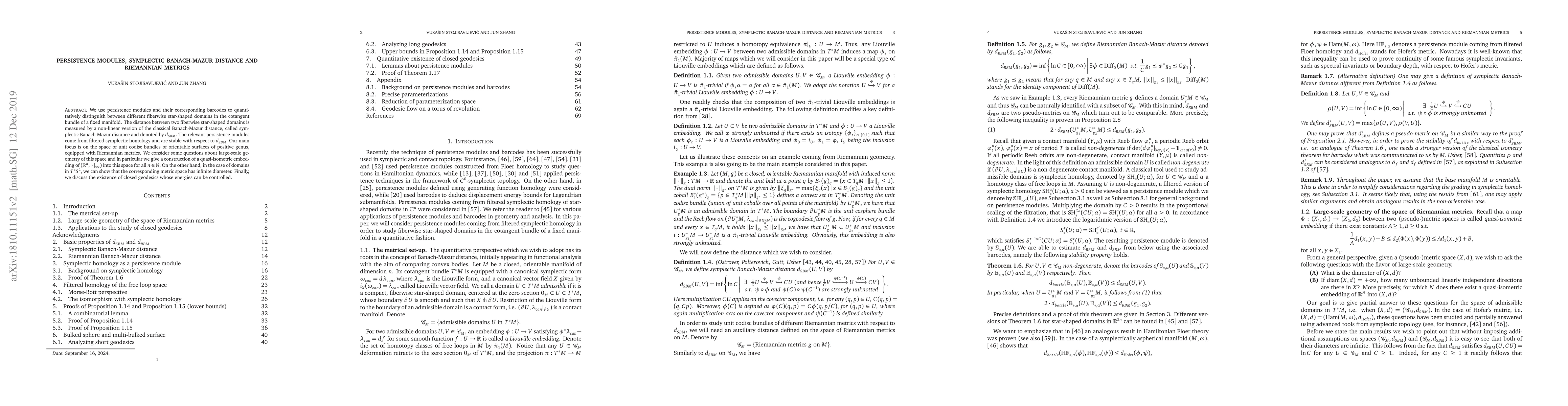 Researchers developed a method to compare geometric shapes in high-dimensional space using persistence modules and symplectic Banach-Mazur distance, with applications to large-scale geometry of manifolds.