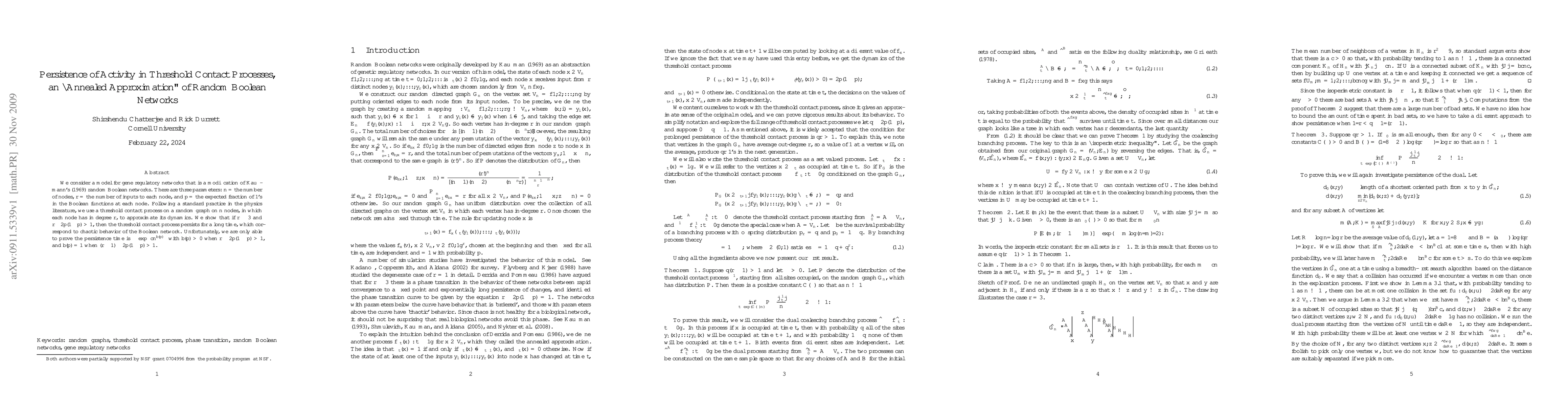 We consider a model for gene regulatory networks that is a modification of Kauffmann's (1969) random Boolean networks. There are three parameters: $n =$ the number of nodes, $r =$ the number of inputs to each node, and $p =$ the expected fraction of 1's in the Boolean functions at each node. Following a standard practice in the physics literature, we use a threshold contact process on a random graph on $n$ nodes, in which each node has in degree $r$, to approximate its dynamics. We show that if $r\ge 3$ and $r \cdot 2p(1-p)>1$, then the threshold contact process persists for a long time, which correspond to chaotic behavior of the Boolean network. Unfortunately, we are only able to prove the persistence time is $\ge \exp(cn^{b(p)})$ with $b(p)>0$ when $r\cdot 2p(1-p)> 1$, and $b(p)=1$ when $(r-1)\cdot 2p(1-p)>1$.