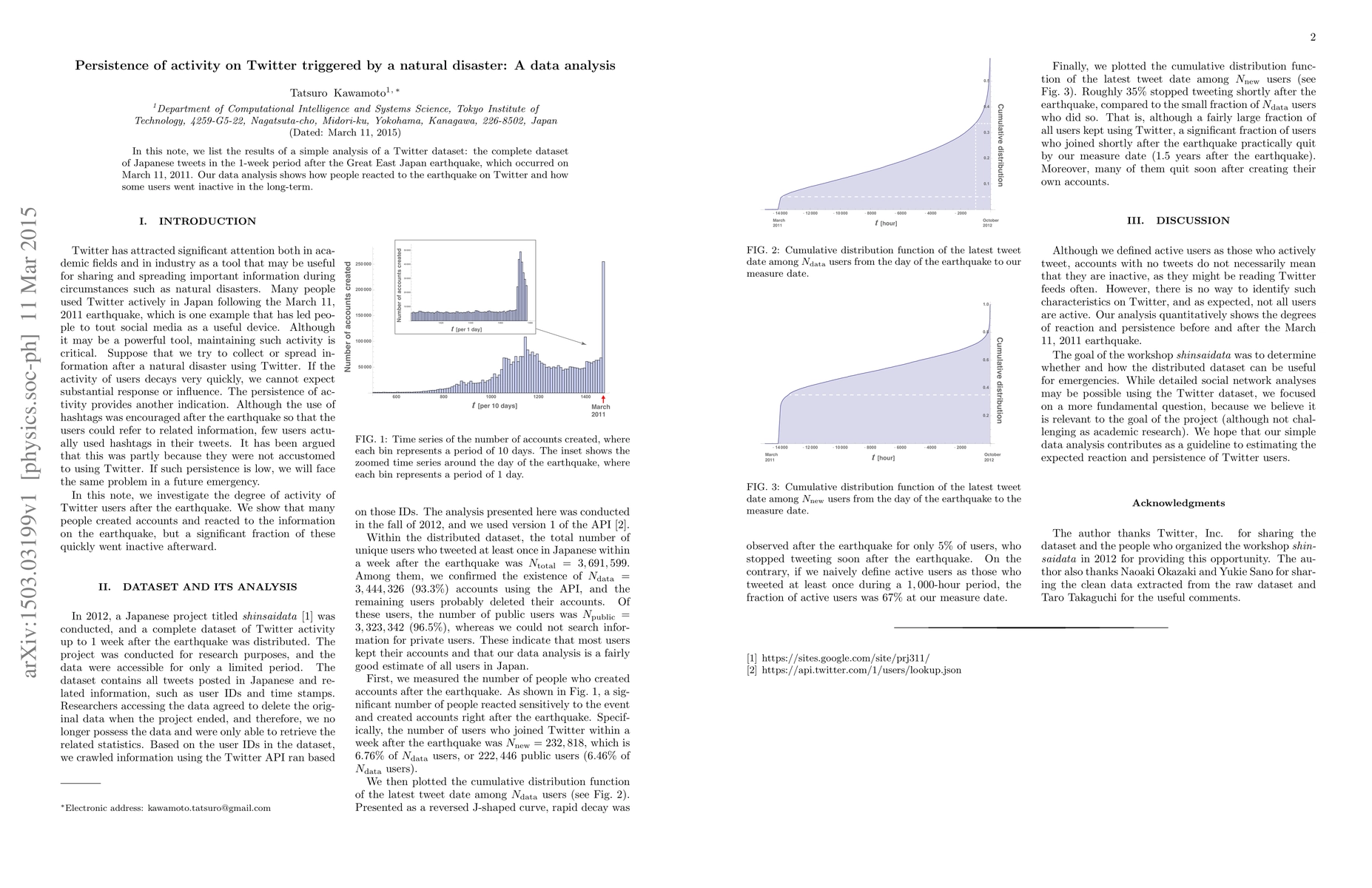 This study analyzes Japanese tweets from the week following the 2011 Great East Japan earthquake, revealing Twitter activity patterns and long-term user inactivity triggered by the disaster.