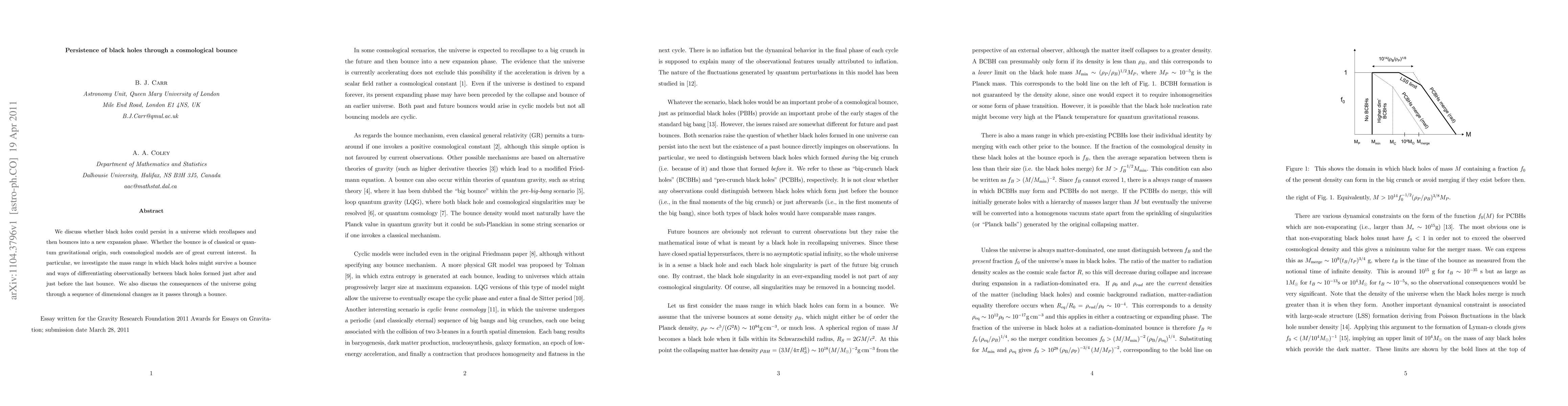 This paper explores the persistence of black holes through a cosmological bounce, investigating the mass range for black hole survival post-bounce and observational methods to distinguish black holes formed before and after the last bounce. It also examines the implications of dimensional changes during the universe's bounce sequence.