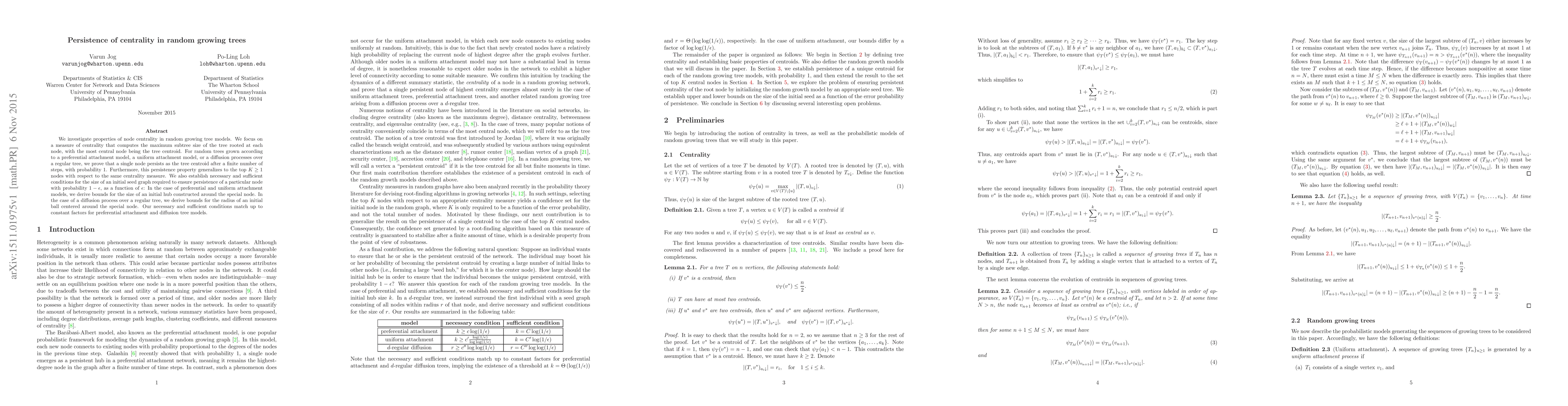 This research proves that in random growing tree models, a single node consistently remains the centroid, determined by maximum subtree size, after a finite number of steps with probability 1. This persistence also applies to the top K nodes. The study also provides conditions for an initial seed graph size to ensure a specific node's persistence with probability 1-ε, giving bounds for preferential and uniform attachment models, and diffusion processes over regular trees.