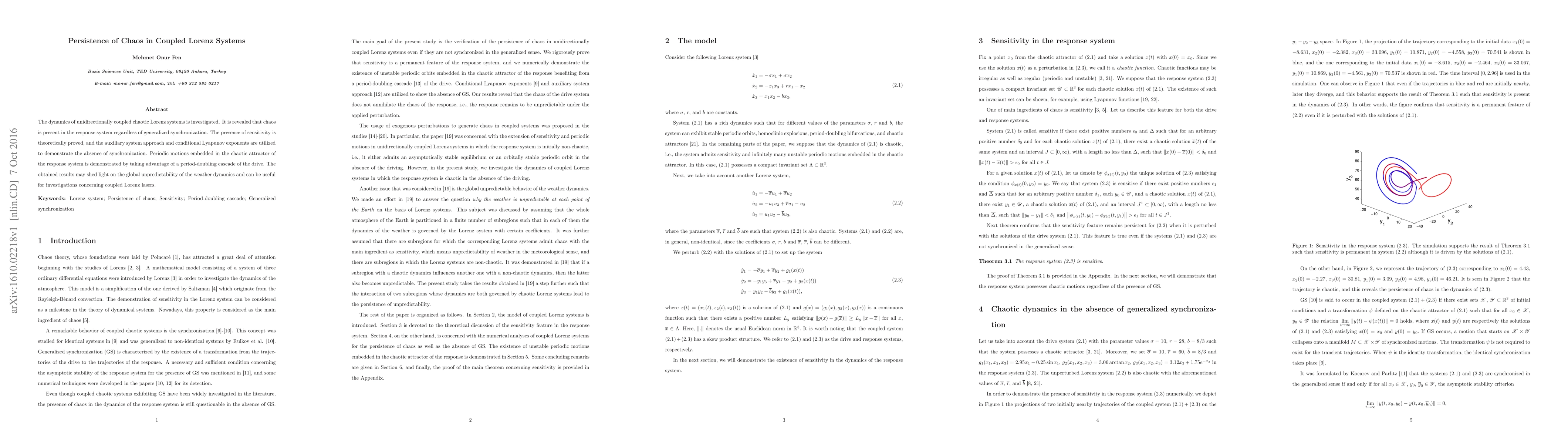 The dynamics of unidirectionally coupled chaotic Lorenz systems is investigated. It is revealed that chaos is present in the response system regardless of generalized synchronization. The presence of sensitivity is theoretically proved, and the auxiliary system approach and conditional Lyapunov exponents are utilized to demonstrate the absence of synchronization. Periodic motions embedded in the chaotic attractor of the response system is demonstrated by taking advantage of a period-doubling cascade of the drive. The obtained results may shed light on the global unpredictability of the weather dynamics and can be useful for investigations concerning coupled Lorenz lasers.