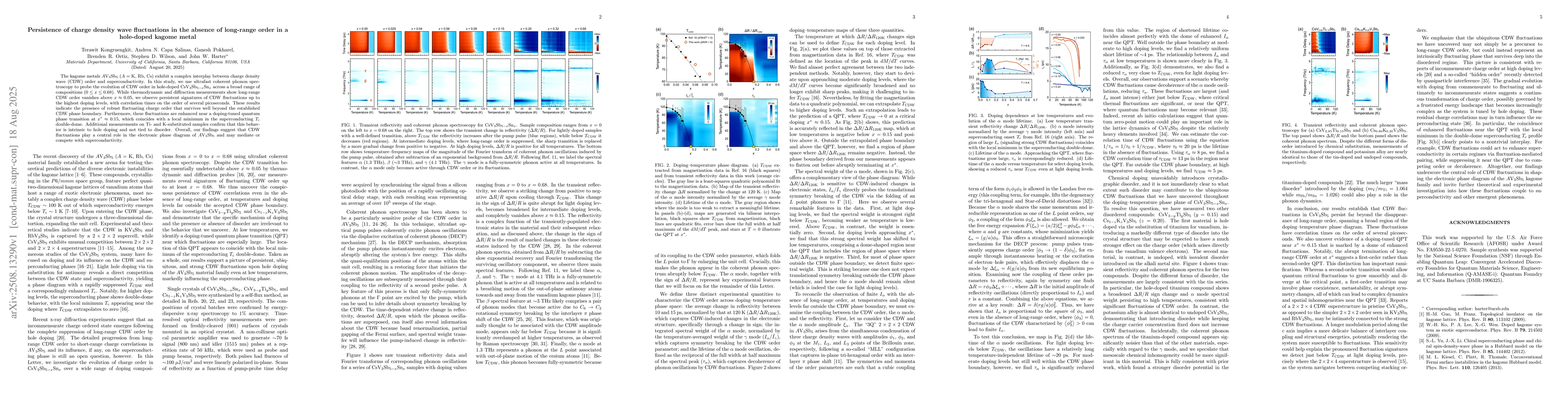 The kagome metals $A$V$_3$Sb$_5$ ($A$ = K, Rb, Cs) exhibit a complex interplay between charge density wave (CDW) order and superconductivity. In this study, we use ultrafast coherent phonon spectroscopy to probe the evolution of CDW order in hole-doped CsV$_3$Sb$_{5-x}$Sn$_x$ across a broad range of compositions ($0 \leq x \leq 0.68$). While thermodynamic and diffraction measurements show long-range CDW order vanishes above $x \approx 0.05$, we observe persistent signatures of CDW fluctuations up to the highest doping levels, with correlation times on the order of several picoseconds. These results indicate the presence of robust fluctuating charge order that survives well beyond the established CDW phase boundary. Furthermore, these fluctuations are enhanced near a doping-tuned quantum phase transition at $x^* \approx 0.15$, which coincides with a local minimum in the superconducting $T_\mathrm{c}$ double-dome. Additional measurements on Ti- and K-substituted samples confirm that this behavior is intrinsic to hole doping and not tied to disorder. Overall, our findings suggest that CDW fluctuations play a central role in the electronic phase diagram of $A$V$_3$Sb$_5$ and may mediate or compete with superconductivity.
