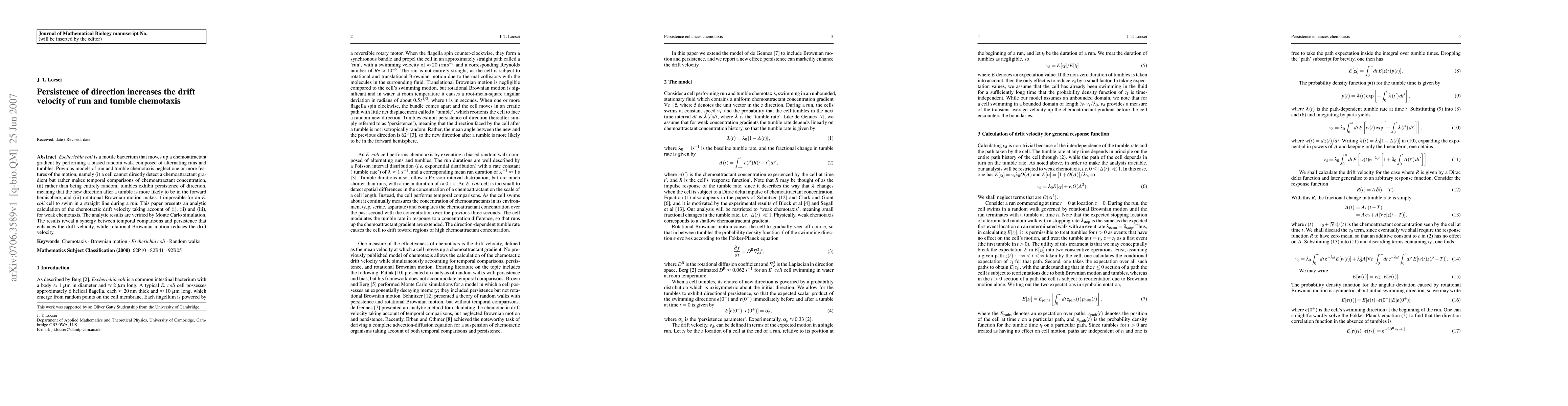 This paper investigates how Escherichia coli's chemotactic behavior is influenced by temporal comparisons of chemoattractant concentration, persistence of direction during tumbles, and rotational Brownian motion. The study finds that persistence enhances drift velocity, while rotational Brownian motion reduces it, revealing a synergistic effect on chemotaxis.