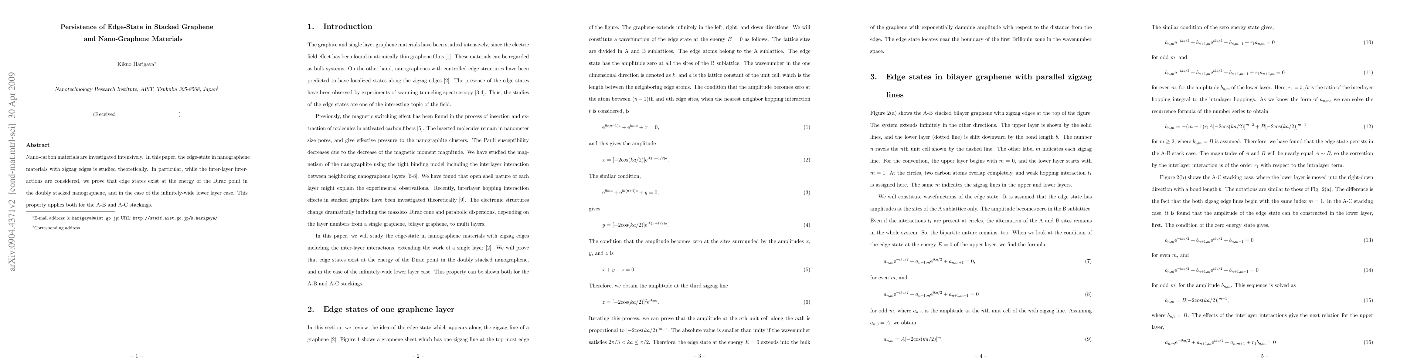 This paper theoretically investigates edge-state persistence in stacked nanographene with zigzag edges, demonstrating that edge states exist at the Dirac point in doubly stacked nanographene, regardless of inter-layer interactions, and applicable to both A-B and A-C stacking configurations.