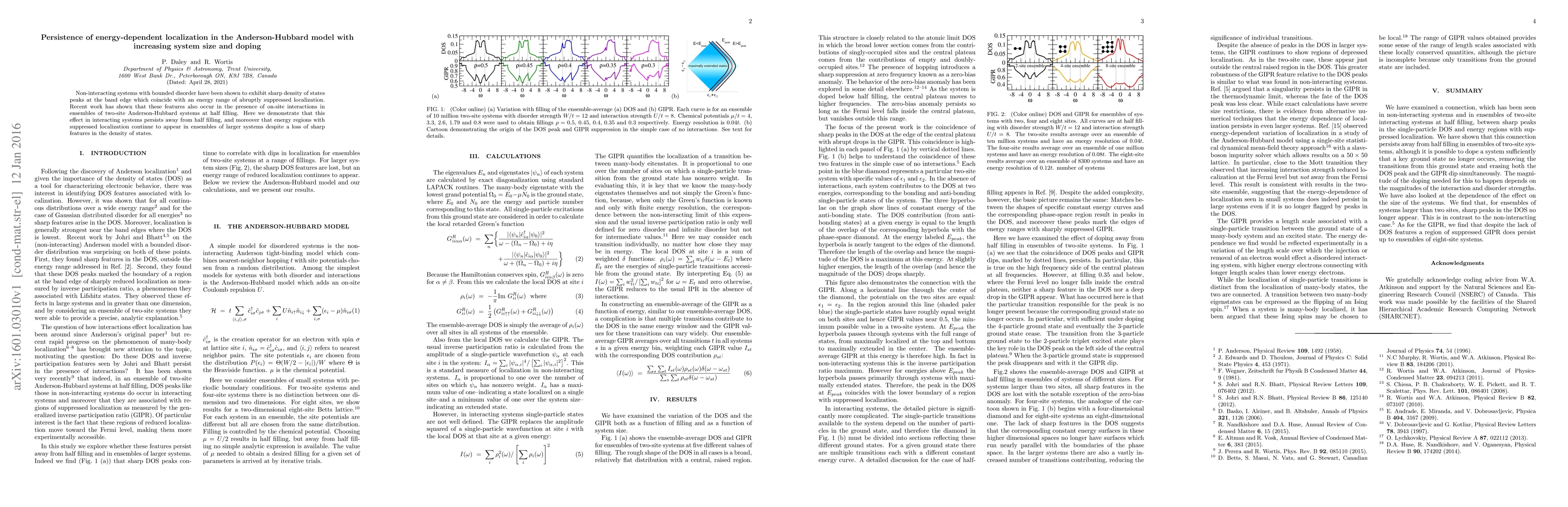 Non-interacting systems with bounded disorder have been shown to exhibit sharp density of states peaks at the band edge which coincide with an energy range of abruptly suppressed localization. Recent work has shown that these features also occur in the presence of on-site interactions in ensembles of two-site Anderson-Hubbard systems at half filling. Here we demonstrate that this effect in interacting systems persists away from half filling, and moreover that energy regions with suppressed localization continue to appear in ensembles of larger systems despite a loss of sharp features in the density of states.