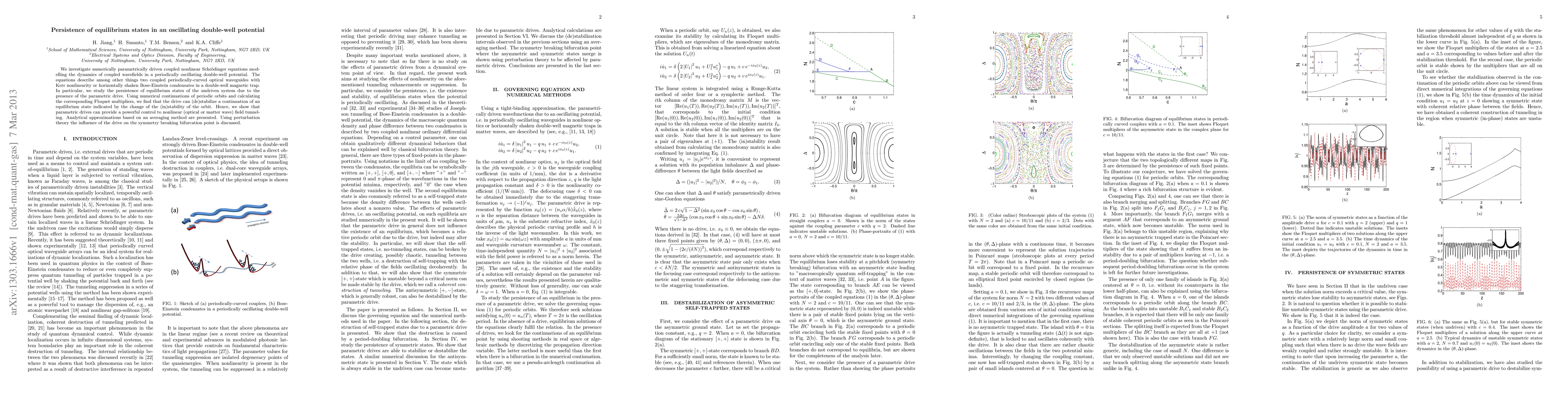 We investigate numerically parametrically driven coupled nonlinear Schrodinger equations modelling the dynamics of coupled wavefields in a periodically oscillating double-well potential. The equations describe among other things two coupled periodically-curved optical waveguides with Kerr nonlinearity or horizontally shaken Bose-Einstein condensates in a double-well magnetic trap. In particular, we study the persistence of equilibrium states of the undriven system due to the presence of the parametric drive. Using numerical continuations of periodic orbits and calculating the corresponding Floquet multipliers, we find that the drive can (de)stabilize a continuation of an equilibrium state indicated by the change of the (in)stability of the orbit. Hence, we show that parametric drives can provide a powerful control to nonlinear (optical or matter wave) field tunneling. Analytical approximations based on an averaging method are presented. Using perturbation theory the influence of the drive on the symmetry breaking bifurcation point is discussed.