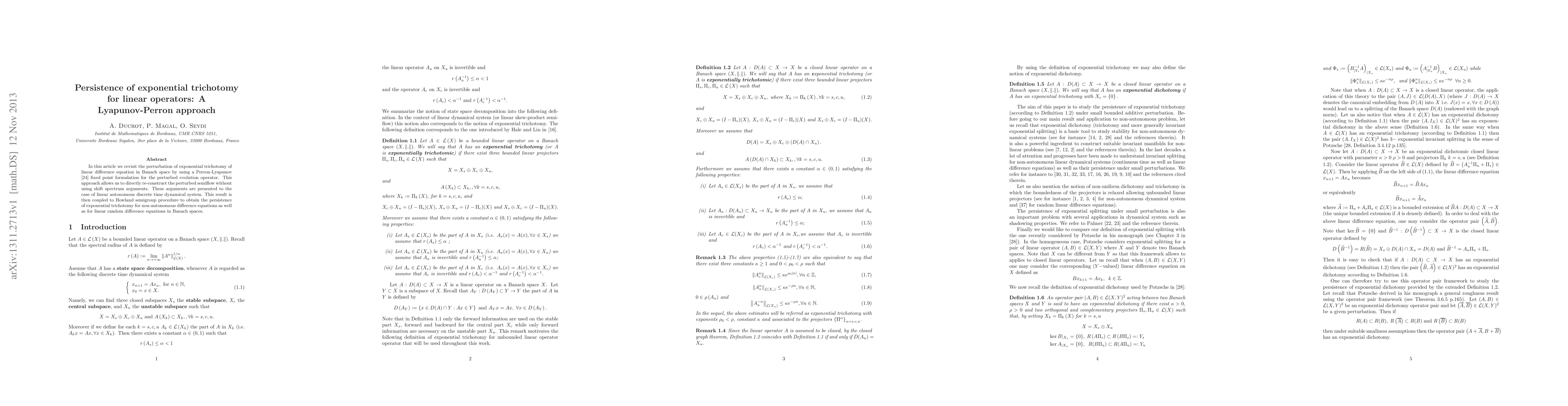 In this article we revisit the perturbation of exponential trichotomy of linear difference equation in Banach space by using a Perron-Lyapunov fixed point formulation for the perturbed evolution operator. This approach allows us to directly re-construct the perturbed semiflow without using shift spectrum arguments. These arguments are presented to the case of linear autonomous discrete time dynamical system. This result is then coupled to Howland semigroup procedure to obtain the persistence of exponential trichotomy for non-autonomous difference equations as well as for linear random difference equations in Banach spaces.