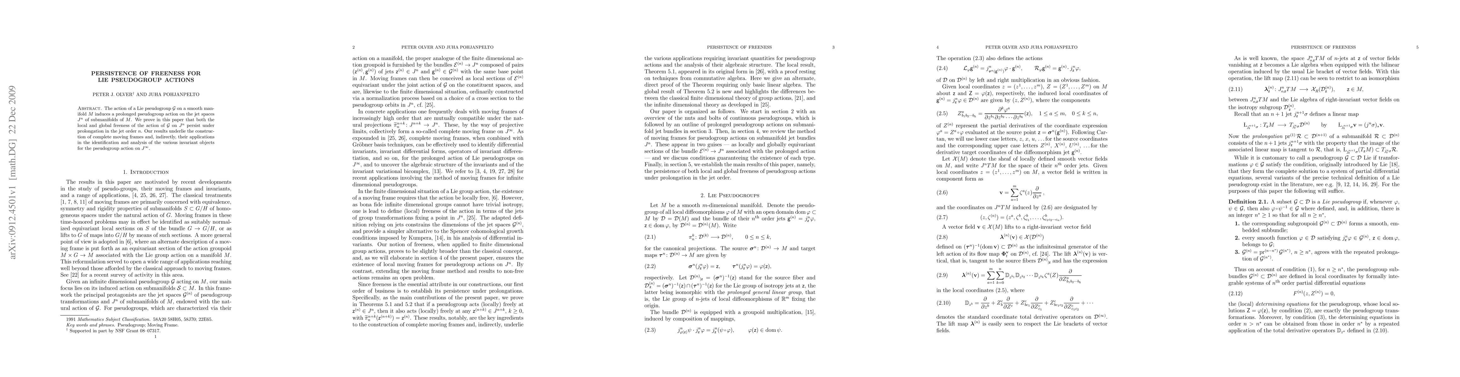 The action of a Lie pseudogroup $G$ on a smooth manifold $M$ induces a prolonged pseudogroup action on the jet spaces $J^n$ of submanifolds of $M$. We prove in this paper that both the local and global freeness of the action of $G$ on $J^n$ persist under prolongation in the jet order $n$. Our results underlie the construction of complete moving frames and, indirectly, their applications in the identification and analysis of the various invariant objects for the pseudogroup action on $J^\infty$.