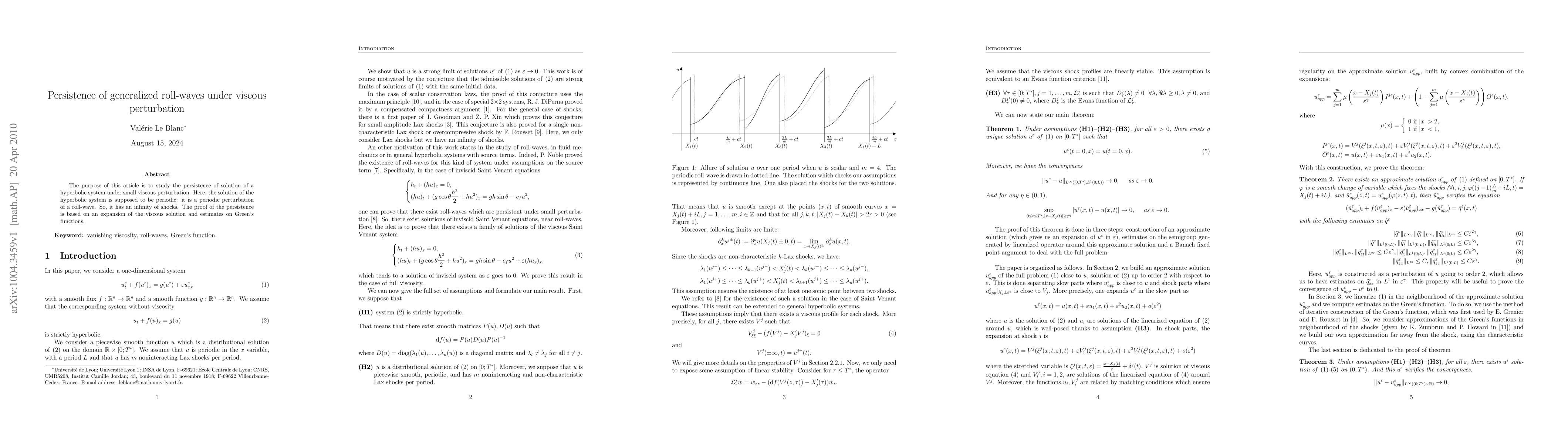 The purpose of this article is to study the persistence of solution of a hyperbolic system under small viscous perturbation. Here, the solution of the hyperbolic system is supposed to be periodic: it is a periodic perturbation of a roll-wave. So, it has an infinity of shocks. The proof of the persistence is based on an expansion of the viscous solution and estimates on Green's functions.