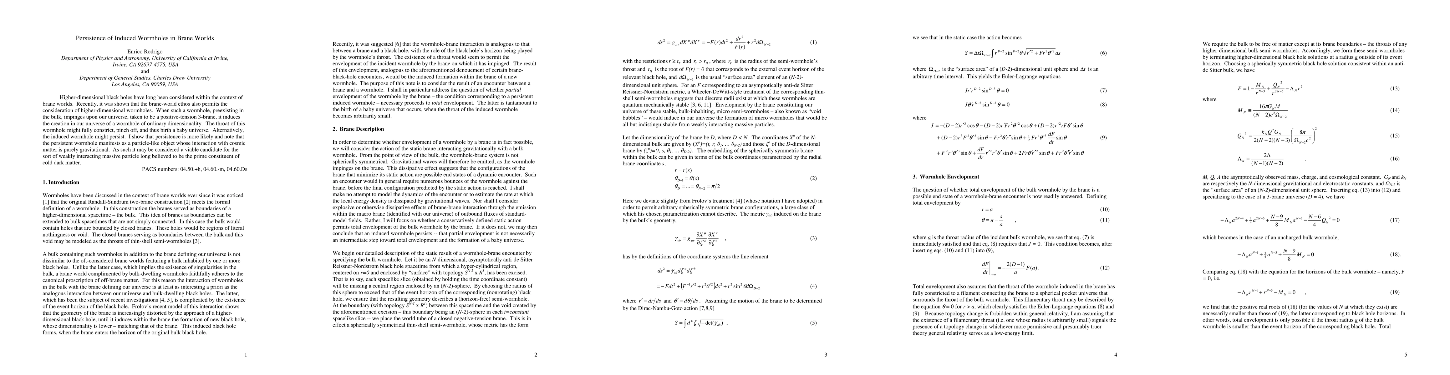 This paper explores the persistence of higher-dimensional wormholes induced in our universe when they impinge upon it from the bulk. It concludes that persistent wormholes are more likely to occur and could manifest as weakly interacting massive particles, potentially contributing to cold dark matter.