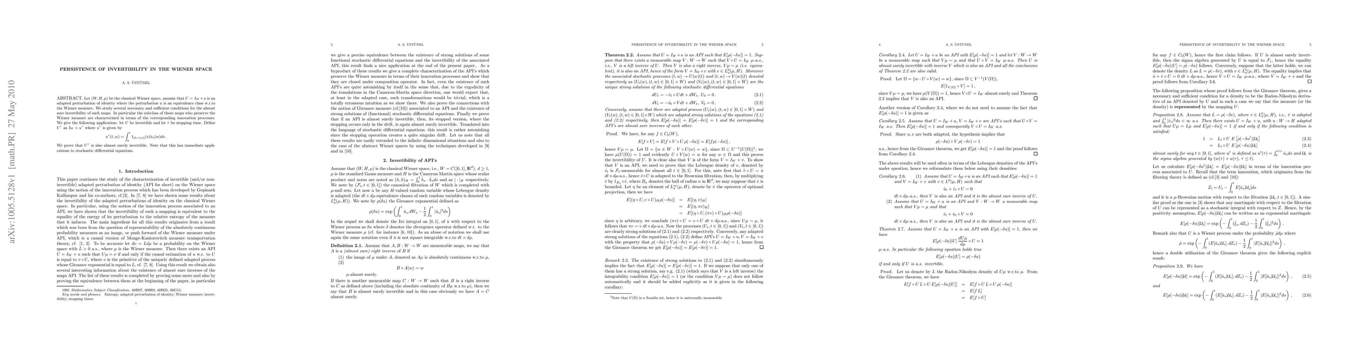 Let $(W,H,\mu)$ be the classical Wiener space, assume that $U=I_W+u$ is an adapted perturbation of identity where the perturbation $u$ is an equivalence class w.r.to the Wiener measure. We study several necessary and sufficient conditions for the almost sure invertibility of such maps. In particular the subclass of these maps who preserve the Wiener measure are characterized in terms of the corresponding innovation processes. We give the following application: let $U$ be invertible and let $\tau$ be stopping time. Define $U^\tau$ as $I_W+u^\tau$ where $u^\tau$ is given by $$ u^\tau(t,w)=\int_0^t 1_{[0,\tau(w)]}(s)\dot{u}_s(w)ds\,. $$ We prove that $U^\tau$ is also almost surely invertible. Note that this has immediate applications to stochastic differential equations.