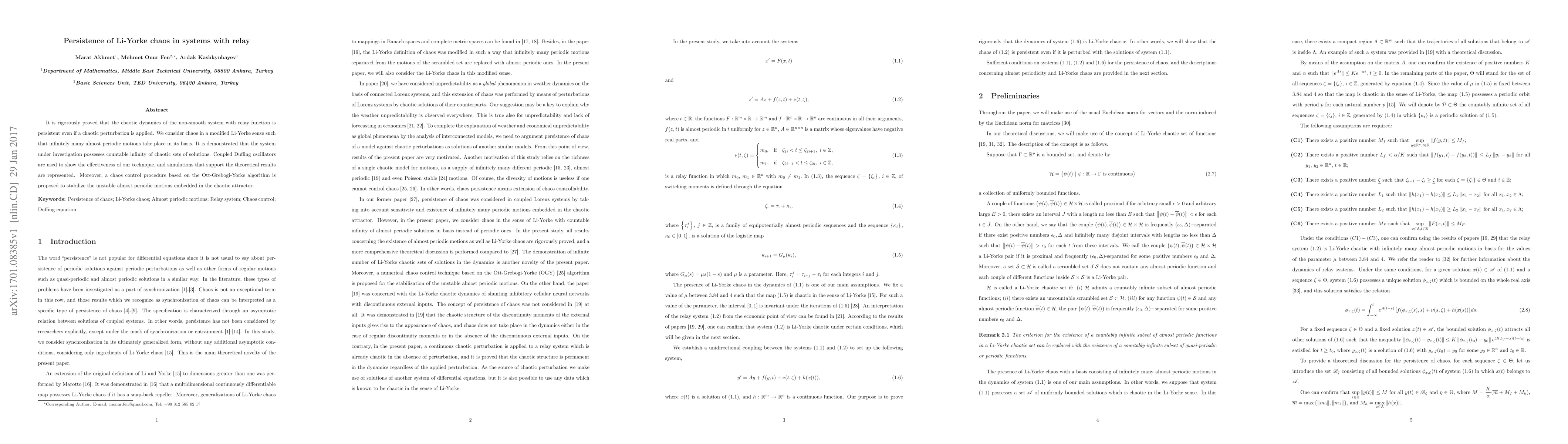 It is rigorously proved that the chaotic dynamics of the non-smooth system with relay function is persistent even if a chaotic perturbation is applied. We consider chaos in a modified Li-Yorke sense such that infinitely many almost periodic motions take place in its basis. It is demonstrated that the system under investigation possesses countable infinity of chaotic sets of solutions. Coupled Duffing oscillators are used to show the effectiveness of our technique, and simulations that support the theoretical results are represented. Moreover, a chaos control procedure based on the Ott-Grebogi-Yorke algorithm is proposed to stabilize the unstable almost periodic motions embedded in the chaotic attractor.