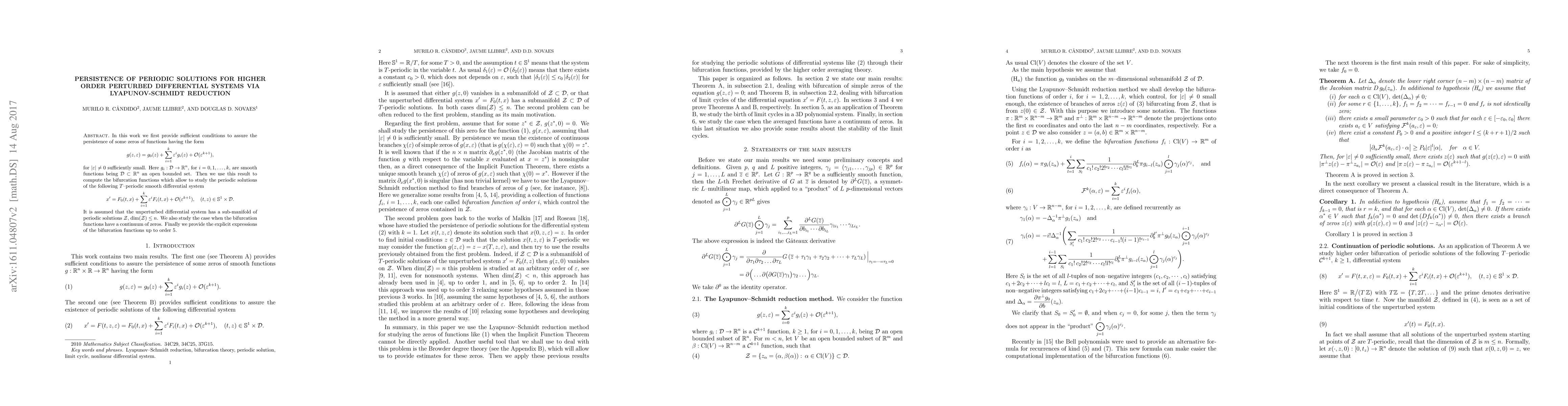 This research establishes conditions for the persistence of periodic solutions in higher-order perturbed differential systems, utilizing Lyapunov-Schmidt reduction. It computes bifurcation functions governing periodic solutions, providing explicit expressions up to order 5, and examines cases with a continuum of zeros.