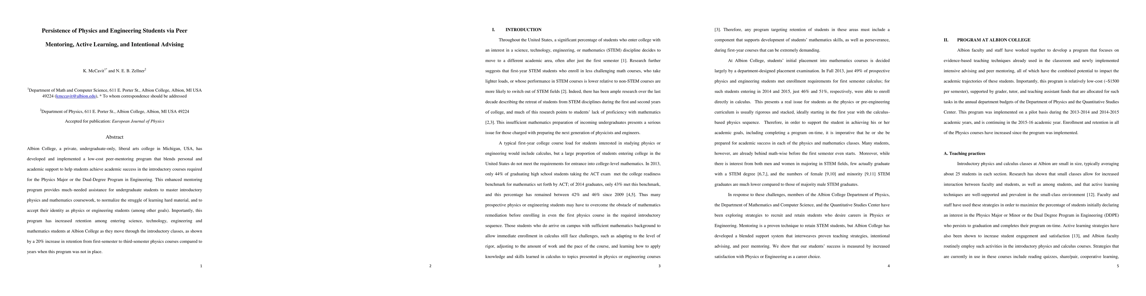 We have developed and implemented a low-cost peer-mentoring program that blends personal and academic support to help students achieve academic success in the introductory courses required for the Physics Major or the Dual-Degree Program in Engineering. As a result of this program, retention has increased among entering science, technology, engineering and mathematics students at Albion College as they move through the introductory classes, as shown by a 20 per cent increase in retention from first-semester to third-semester physics courses compared to years when this program was not in place.
