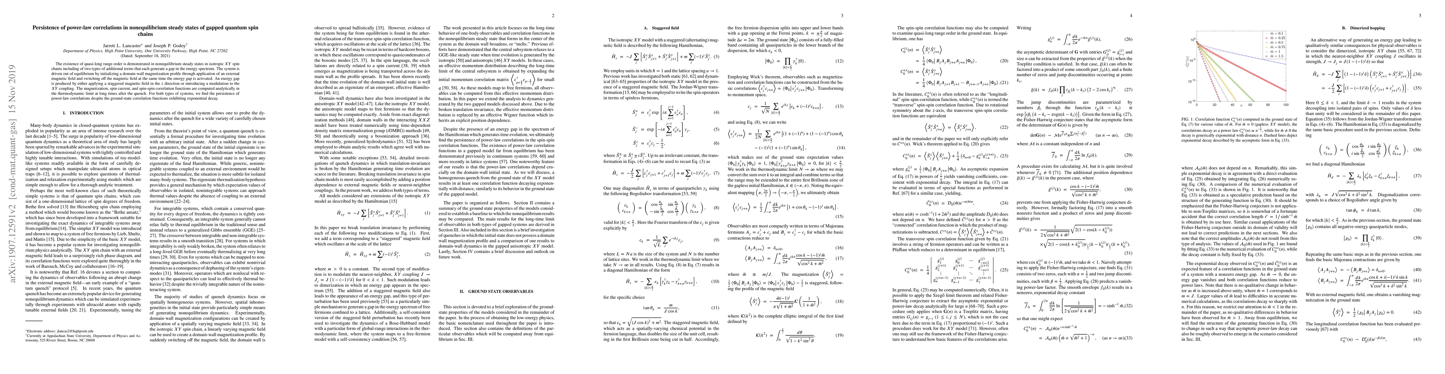 The existence of quasi-long range order is demonstrated in nonequilibrium steady states in isotropic $XY$ spin chains including of two types of additional terms that each generate a gap in the energy spectrum. The system is driven out of equilibrium by initializing a domain-wall magnetization profile through application of an external magnetic field and switching off the magnetic field at the same time the energy gap is activated. An energy gap is produced by either applying a staggered magnetic field in the $z$ direction or introducing a modulation to the $XY$ coupling. The magnetization, spin current, and spin-spin correlation functions are computed analytically in the thermodynamic limit at long times after the quench. For both types of systems, we find the persistence of power-law correlations despite the ground-state correlation functions exhibiting exponential decay.