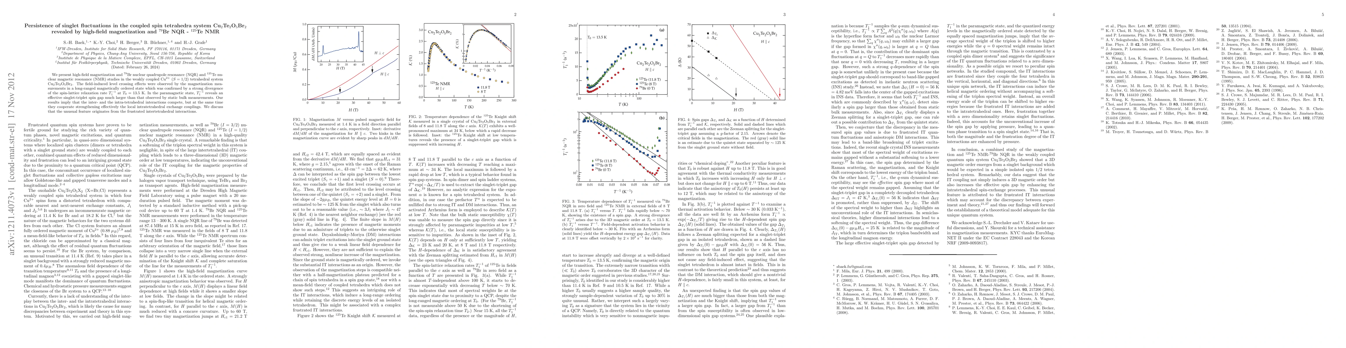 We present high-field magnetization and $^{79}$Br nuclear quadrupole resonance (NQR) and $^{125}$Te nuclear magnetic resonance (NMR) studies in the weakly coupled Cu$^{2+}$ ($S=1/2$) tetrahedral system Cu$_2$Te$_2$O$_5$Br$_2$. The field-induced level crossing effects were observed by the magnetization measurements in a long-ranged magnetically ordered state which was confirmed by a strong divergence of the spin-lattice relaxation rate 1/T1 at T0=13.5 K. In the paramagnetic state, 1/T1 reveals an effective singlet-triplet spin gap much larger than that observed by static bulk measurements. Our results imply that the inter- and the intra-tetrahedral interactions compete, but at the same time they cooperate strengthening effectively the local intratetrahedral exchange couplings. We discuss that the unusual feature originates from the frustrated intertetrahedral interactions.