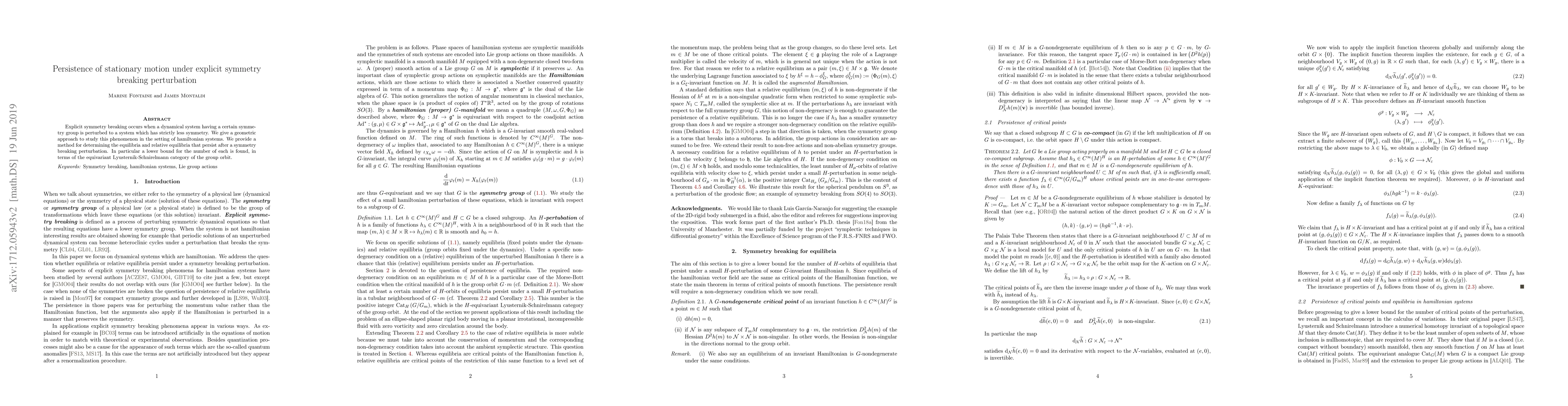 Explicit symmetry breaking occurs when a dynamical system having a certain symmetry group is perturbed in a way that the perturbation preserves only some symmetries of the original system. We give a geometric approach to study this phenomenon in the setting of equivariant Hamiltonian systems. A lower bound for the number of orbits of equilibria and orbits of relative equilibria which persist after a small perturbation is given. This bound is given in terms of the equivariant Lyusternik-Schnirelmann category of the group orbit.