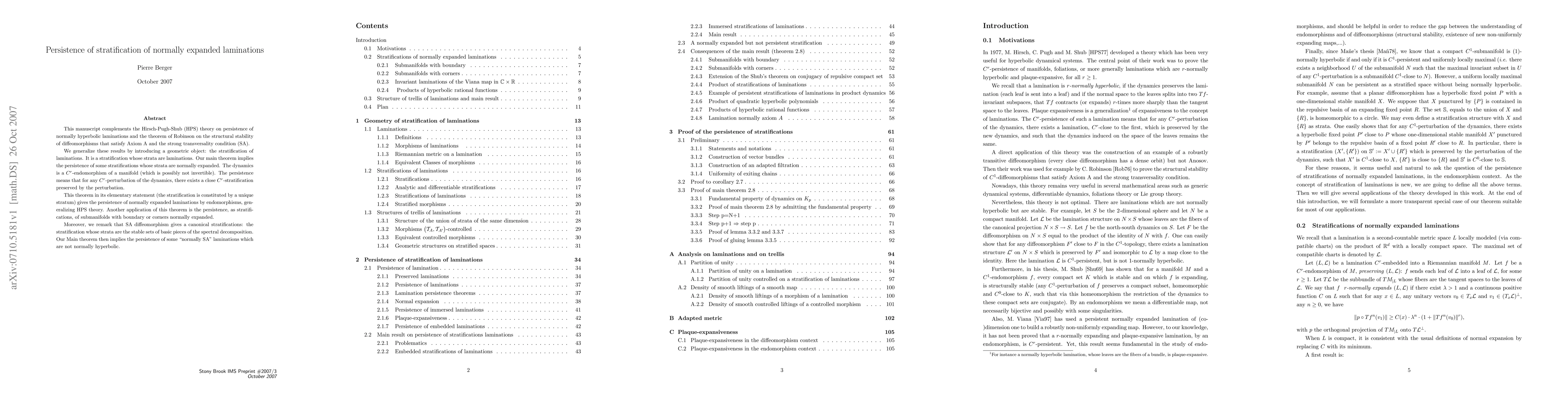 This manuscript complements the Hirsch-Pugh-Shub (HPS) theory on persistence of normally hyperbolic laminations and the theorem of Robinson on the structural stability of diffeomorphisms that satisfy Axiom A and the strong transversality condition (SA). We generalize these results by introducing a geometric object: the stratification of laminations. It is a stratification whose strata are laminations. Our main theorem implies the persistence of some stratifications whose strata are normally expanded. The dynamics is a $C^r$-endomorphism of a manifold (which is possibly not invertible). The persistence means that for any $C^r$-perturbation of the dynamics, there exists a close $C^r$-stratification preserved by the perturbation. This theorem in its elementary statement (the stratification is constituted by a unique stratum) gives the persistence of normally expanded laminations by endomorphisms, generalizing HPS theory. Another application of this theorem is the persistence, as stratifications, of submanifolds with boundary or corners normally expanded. Moreover, we remark that SA diffeomorphism gives a canonical stratifications: the stratification whose strata are the stable sets of basic pieces of the spectral decomposition. Our Main theorem then implies the persistence of some ``normally SA'' laminations which are not normally hyperbolic.