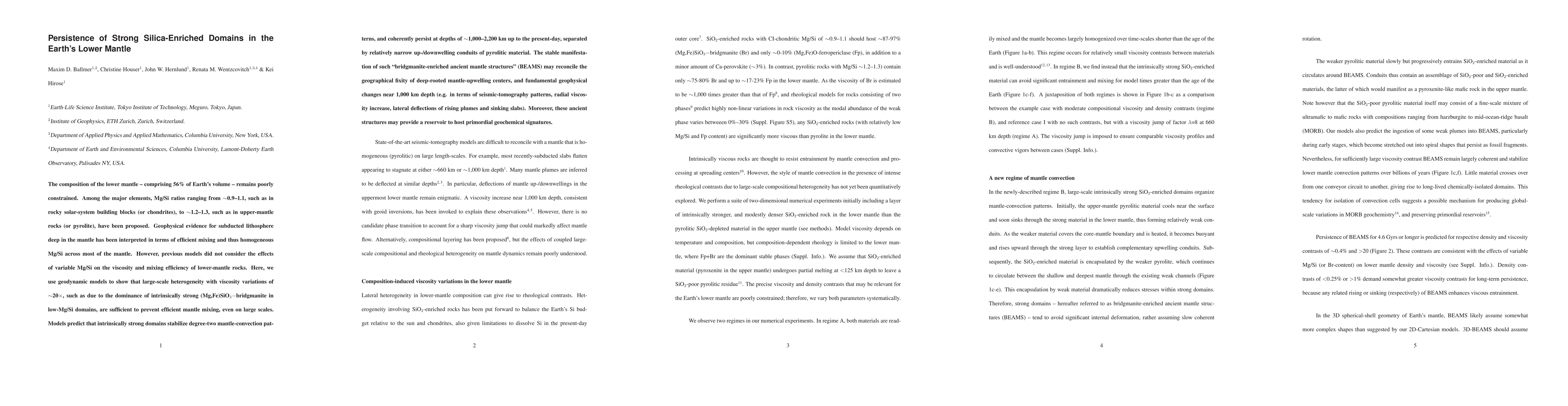This paper demonstrates that large-scale heterogeneity in the Earth's lower mantle, characterized by strong silica-enriched domains, persists due to variations in viscosity and mixing efficiency. These domains, rich in (Mg,Fe)SiO$_3$-bridgmanite, maintain their structure over geological time, influencing geophysical observations and potentially hosting primordial geochemical signatures.