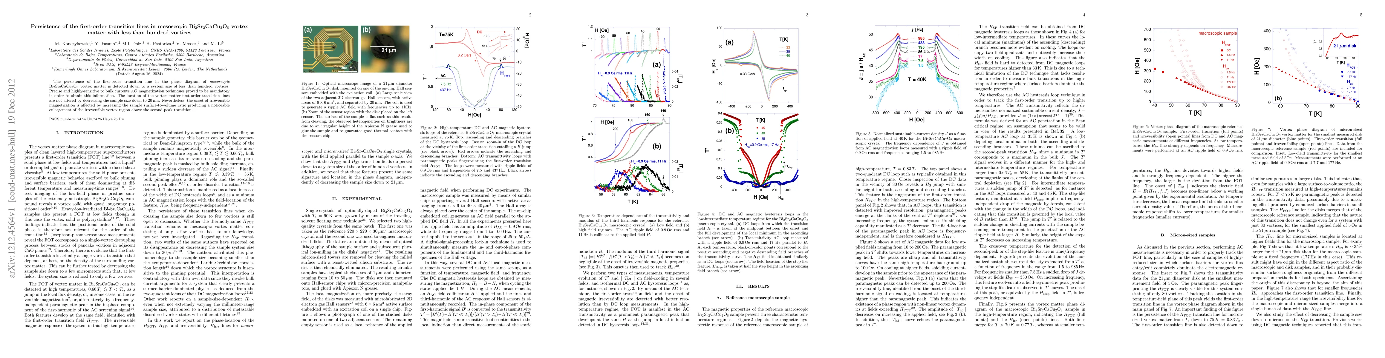 The persistence of the first-order transition line in the phase diagram of mesoscopic Bi$_{2}$Sr$_{2}$CaCu$_{2}$O$_{8}$ vortex matter is detected down to a system size of less than hundred vortices. Precise and highly-sensitive to bulk currents AC magnetization techniques proved to be mandatory in order to obtain this information. The location of the vortex matter first-order transition lines are not altered by decreasing the sample size down to 20 $\mu$m. Nevertheless, the onset of irreversible magnetization is affected by increasing the sample surface-to-volume ratio producing a noticeable enlargement of the irreversible vortex region above the second-peak transition.