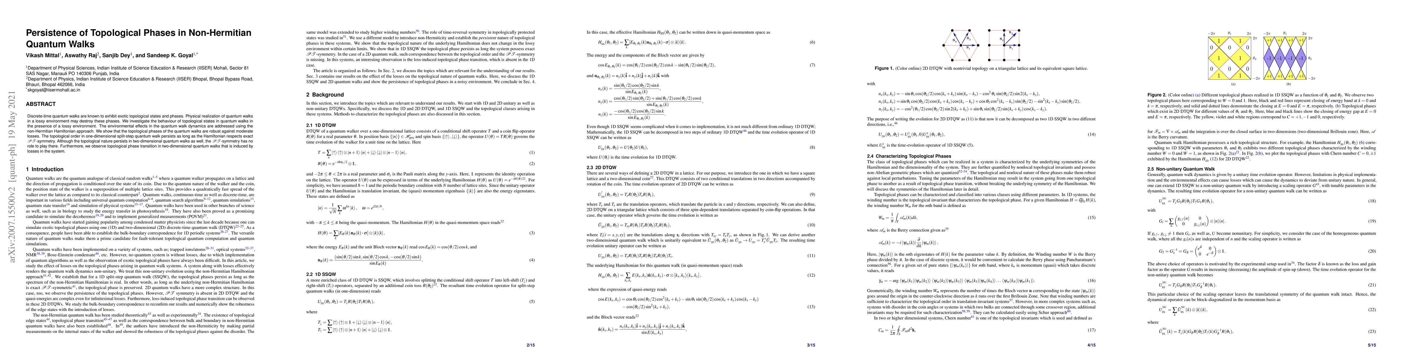 This paper explores how topological phases in quantum walks persist under lossy environmental conditions using non-Hermitian Hamiltonians. It demonstrates that one-dimensional walks maintain topological order as long as they are $\mathcal{PT}$-symmetric, while two-dimensional walks exhibit noise-induced topological phase transitions regardless of $\mathcal{PT}$-symmetry.