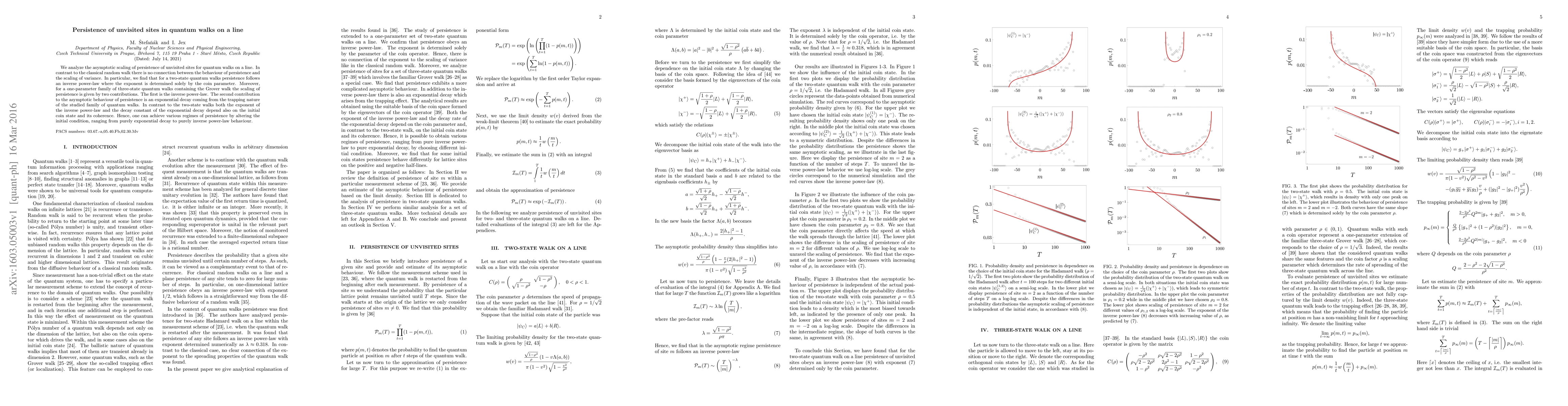This paper investigates the asymptotic behavior of unvisited sites in quantum walks on a line, revealing distinct scaling behaviors compared to classical random walks. For two-state quantum walks, persistence follows an inverse power-law determined by the coin parameter, while for three-state walks, persistence exhibits both an inverse power-law and an exponential decay, influenced by the initial coin state and its coherence.