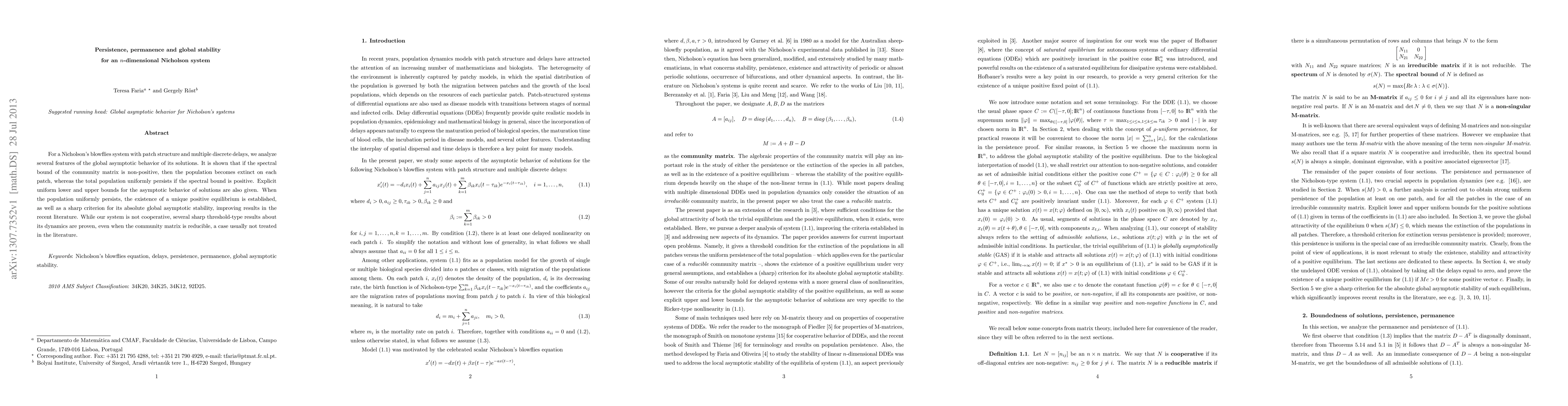 For a Nicholson's blowflies system with patch structure and multiple discrete delays, we analyze several features of the global asymptotic behavior of its solutions. It is shown that if the spectral bound of the community matrix is non-positive, then the population becomes extinct on each patch, whereas the total population uniformly persists if the spectral bound is positive. Explicit uniform lower and upper bounds for the asymptotic behavior of solutions are also given. When the population uniformly persists, the existence of a unique positive equilibrium is established, as well as a sharp criterion for its absolute global asymptotic stability, improving results in the recent literature. While our system is not cooperative, several sharp threshold-type results about its dynamics are proven, even when the community matrix is reducible, a case usually not treated in the literature.