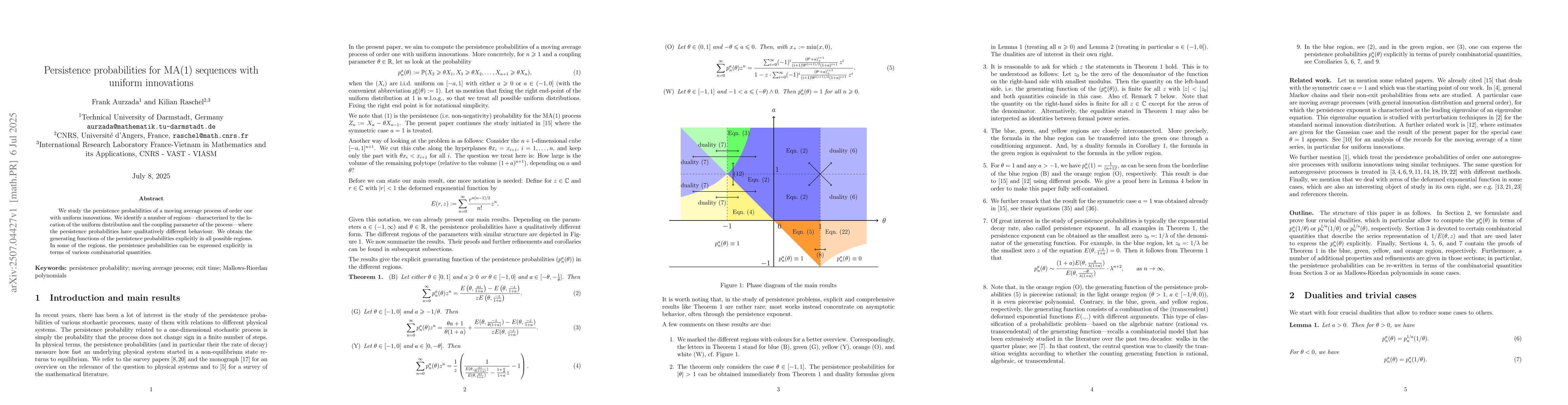 This research derives explicit generating functions for persistence probabilities of MA(1) processes with uniform innovations, identifying distinct regions with varying behavior and some cases expressible via combinatorial quantities.