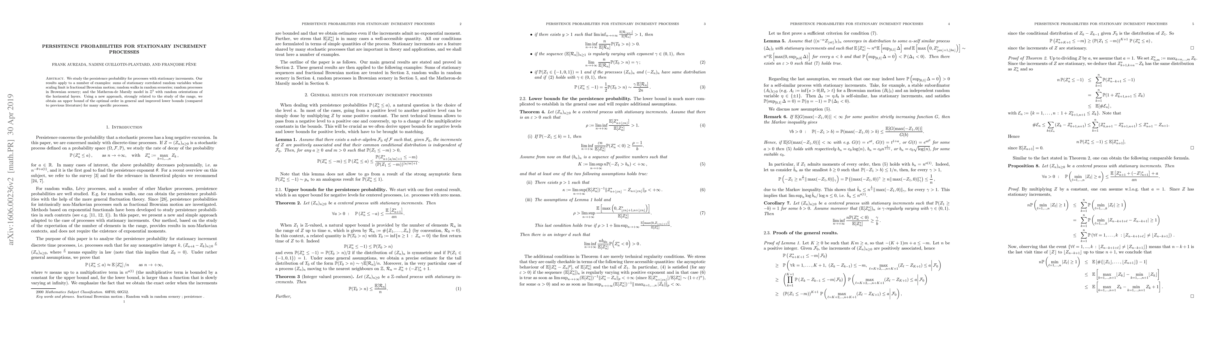 The paper employs a novel approach related to the study of the range, focusing on persistence probabilities for processes with stationary increments, including sums of stationary correlated random variables, random walks in random sceneries, and the Matheron-de Marsily model in Z^2 with random orientations.