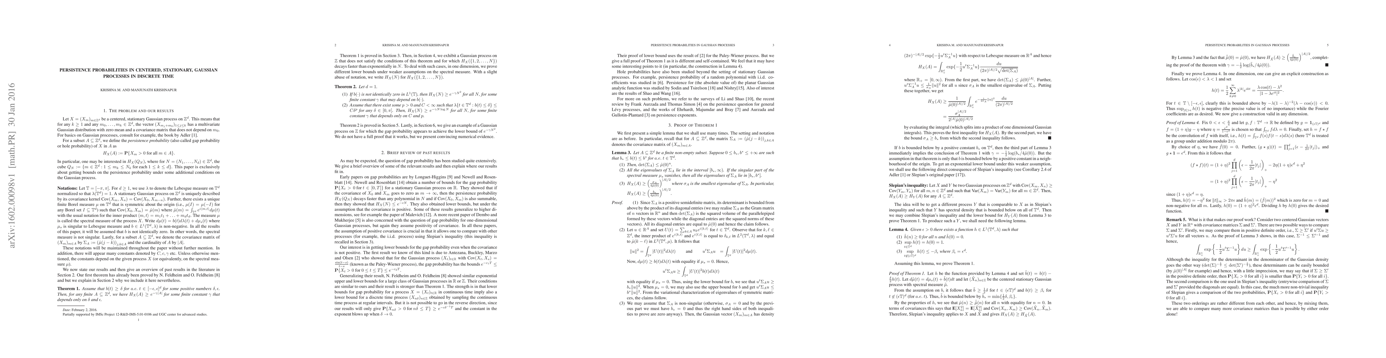The paper presents a detailed proof of Theorem 1 concerning persistence probabilities, along with Lemma 3 that provides bounds on determinants and eigenvalues of covariance matrices for discrete Gaussian processes.