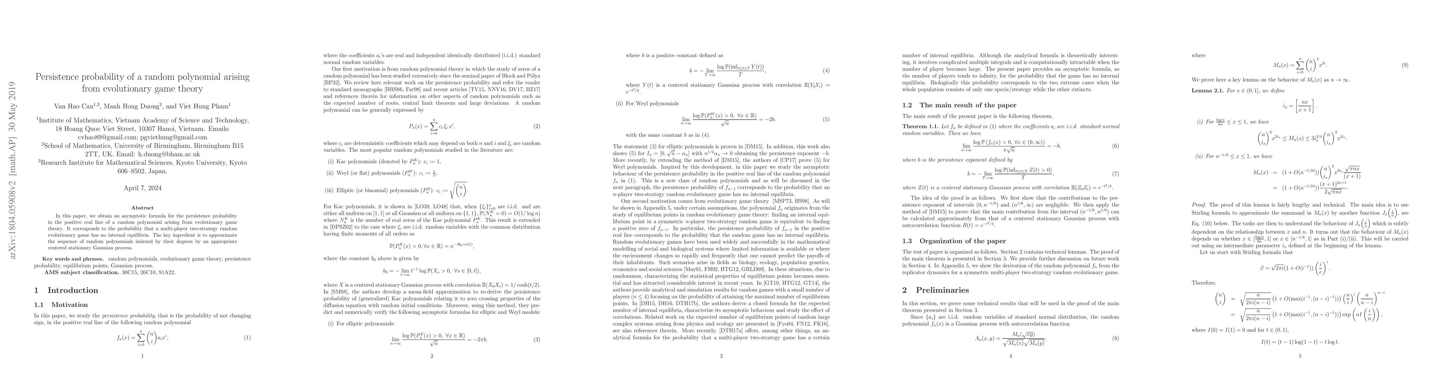 This paper derives an asymptotic formula for the persistence probability of a random polynomial from evolutionary game theory, showing the likelihood of no internal equilibria in a multi-player, two-strategy game. The key method involves approximating the random polynomial sequence with a centered stationary Gaussian process.
