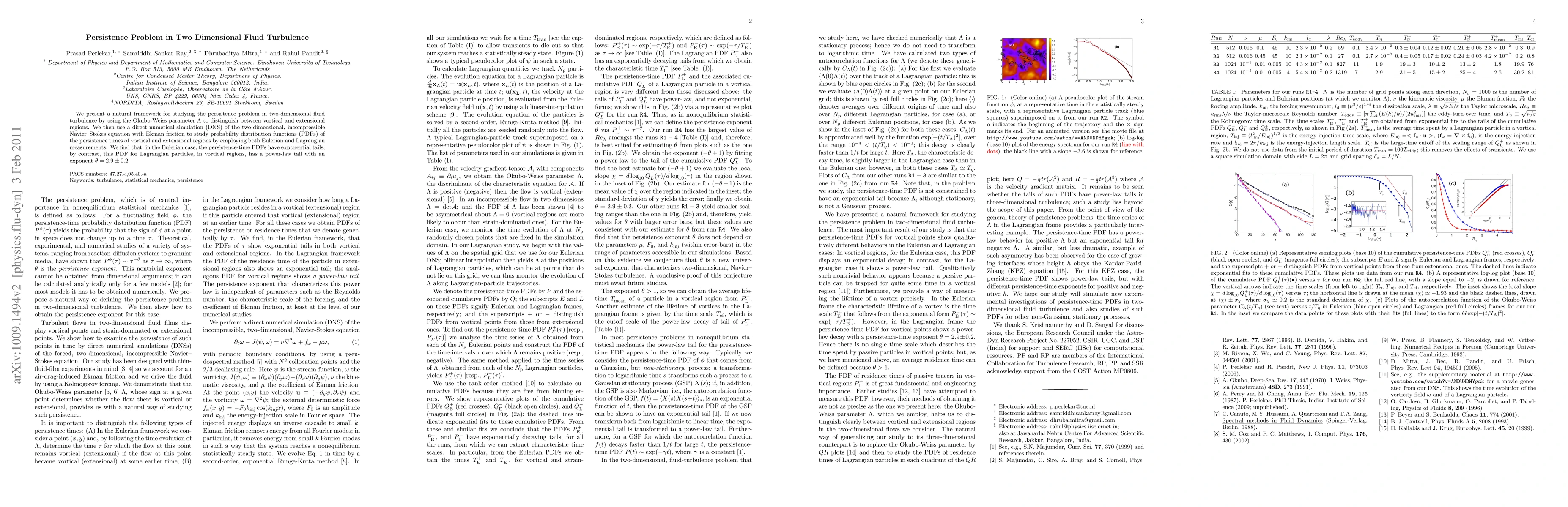 This paper investigates the persistence problem in two-dimensional fluid turbulence using the Okubo-Weiss parameter to differentiate vortical and extensional regions. Direct numerical simulations reveal that Eulerian persistence-time PDFs have exponential tails, while Lagrangian persistence-time PDFs in vortical regions exhibit a power-law tail with an exponent of $\theta=2.9\pm0.2$.