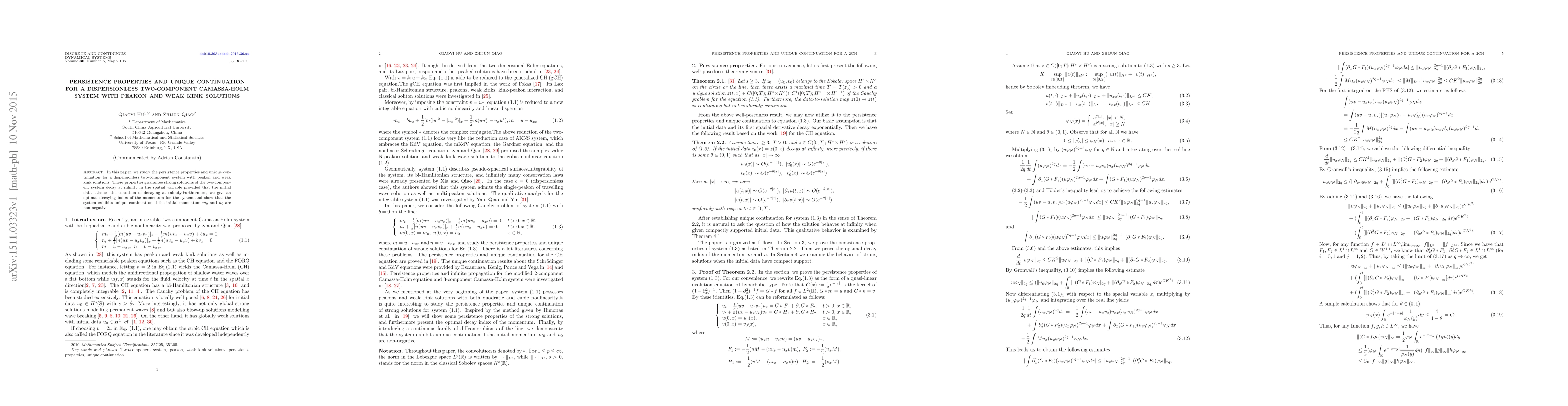 This paper investigates the persistence properties and unique continuation for a dispersionless two-component Camassa-Holm system featuring peakon and weak kink solutions. It demonstrates that strong solutions decay at infinity when initial data decays, and provides an optimal decay index for the momentum, while also showing unique continuation if initial momenta are non-negative.