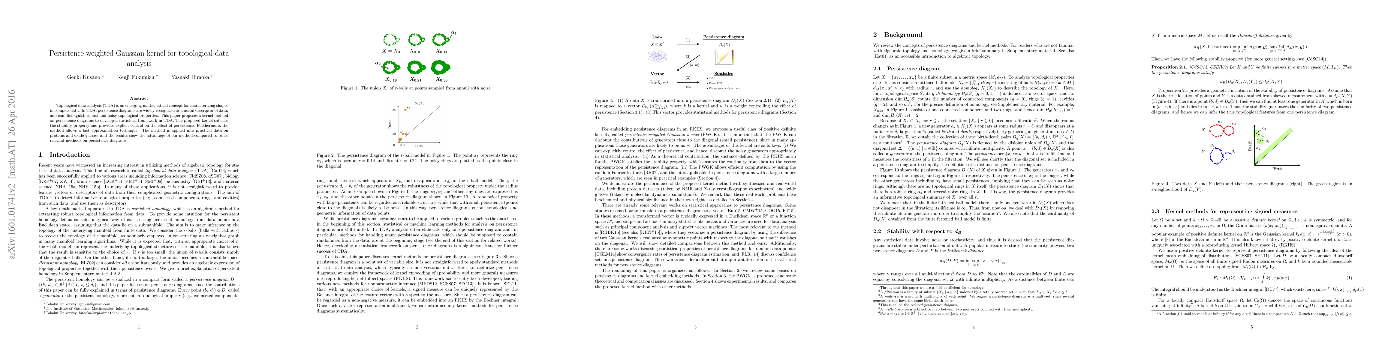 This paper introduces a persistence weighted Gaussian kernel for analyzing topological data, offering a stable statistical framework with explicit control over persistence effects. The proposed method demonstrates advantages in analyzing complex data, such as proteins and oxide glasses, outperforming existing techniques.