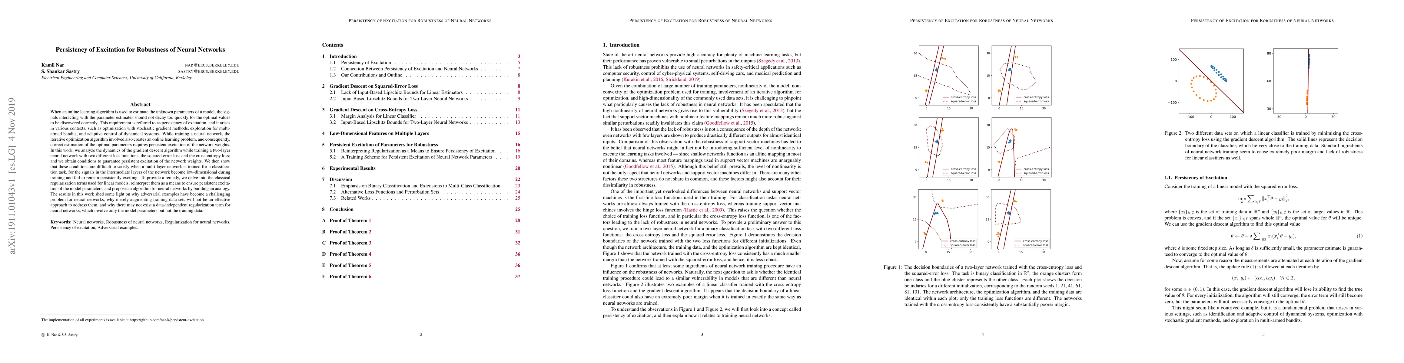 When an online learning algorithm is used to estimate the unknown parameters of a model, the signals interacting with the parameter estimates should not decay too quickly for the optimal values to be discovered correctly. This requirement is referred to as persistency of excitation, and it arises in various contexts, such as optimization with stochastic gradient methods, exploration for multi-armed bandits, and adaptive control of dynamical systems. While training a neural network, the iterative optimization algorithm involved also creates an online learning problem, and consequently, correct estimation of the optimal parameters requires persistent excitation of the network weights. In this work, we analyze the dynamics of the gradient descent algorithm while training a two-layer neural network with two different loss functions, the squared-error loss and the cross-entropy loss; and we obtain conditions to guarantee persistent excitation of the network weights. We then show that these conditions are difficult to satisfy when a multi-layer network is trained for a classification task, for the signals in the intermediate layers of the network become low-dimensional during training and fail to remain persistently exciting. To provide a remedy, we delve into the classical regularization terms used for linear models, reinterpret them as a means to ensure persistent excitation of the model parameters, and propose an algorithm for neural networks by building an analogy. The results in this work shed some light on why adversarial examples have become a challenging problem for neural networks, why merely augmenting training data sets will not be an effective approach to address them, and why there may not exist a data-independent regularization term for neural networks, which involve only the model parameters but not the training data.