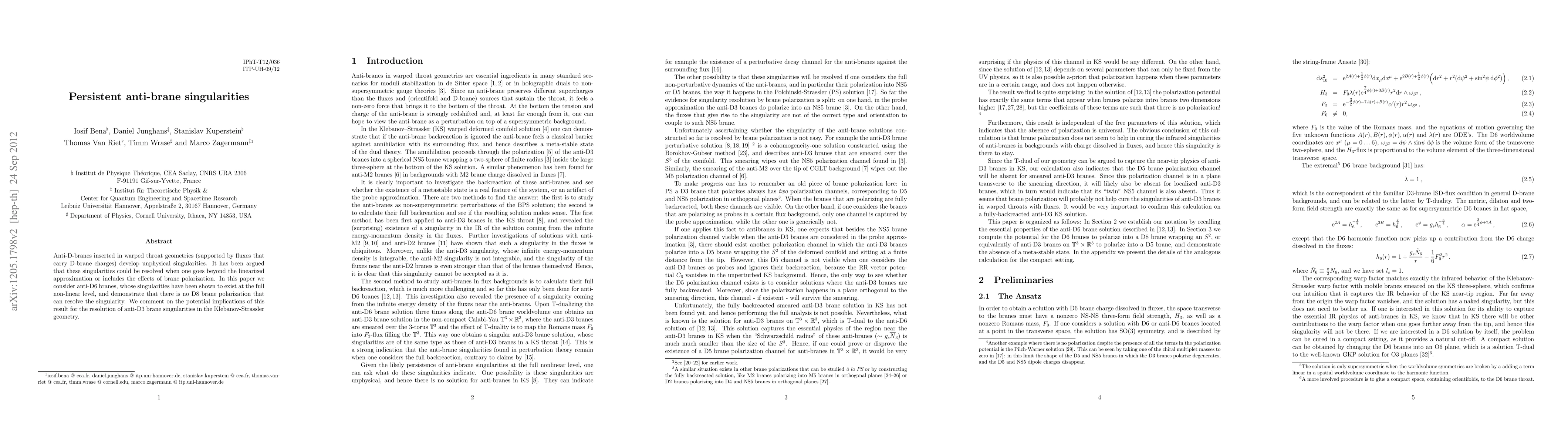 This paper investigates the persistent singularities of anti-D6 branes in warped throat geometries, showing that no D8 brane polarization can resolve them, and discusses the implications for resolving singularities in anti-D3 branes in Klebanov-Strassler geometry.