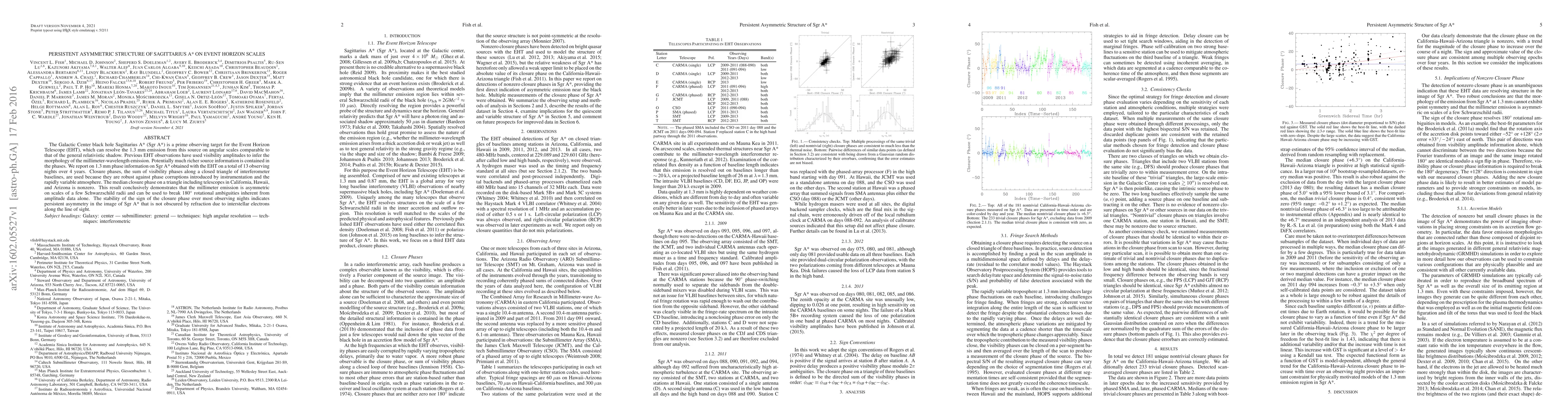 The Event Horizon Telescope (EHT) has captured 1.3 mm phase information of Sagittarius A* over 4 years, revealing persistent asymmetric structure on scales comparable to the black hole's event horizon. The nonzero median closure phase indicates an enduring asymmetry not obscured by interstellar electron refraction.