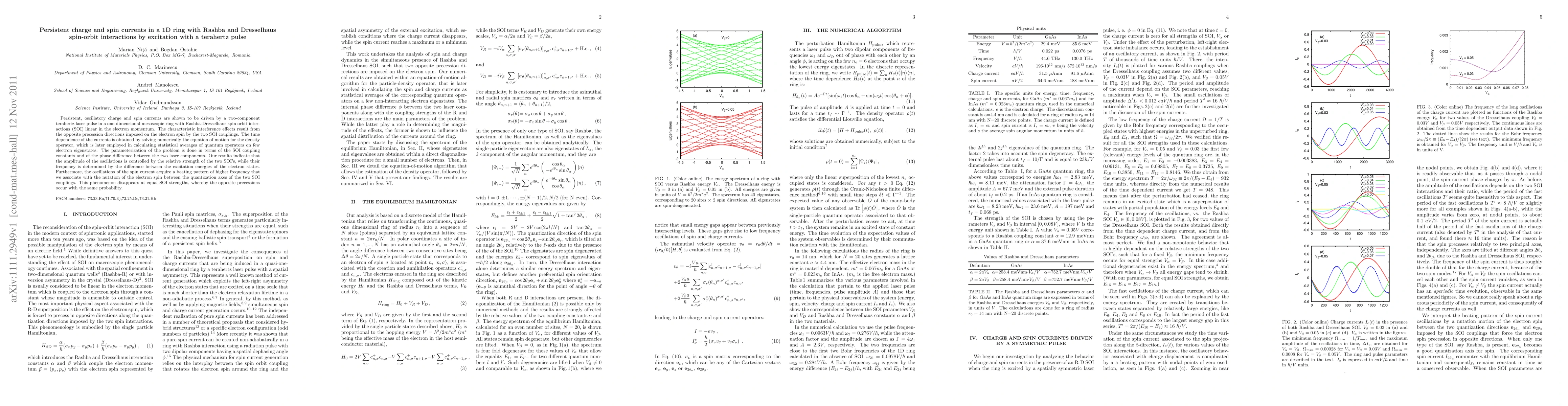 This paper investigates persistent, oscillatory charge and spin currents in a 1D ring with Rashba and Dresselhaus spin-orbit interactions driven by a terahertz pulse. The study reveals that the amplitude of oscillations depends on the relative strength of the spin-orbit interactions, while their frequency is determined by the difference in excitation energies of electron states.