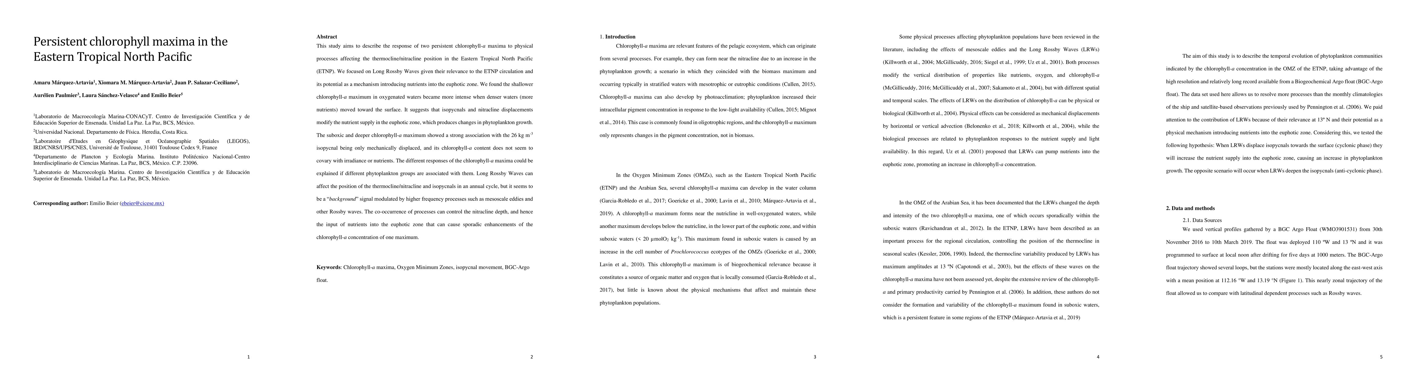 This study investigates the persistent chlorophyll-a maxima in the Eastern Tropical North Pacific, finding that the shallower maximum intensifies with nutrient-rich waters moving to the surface, while the deeper maximum remains unaffected by nutrient availability, suggesting different phytoplankton groups are involved. Long Rossby Waves influence the thermocline and nitracline, modulating nutrient input and phytoplankton growth.