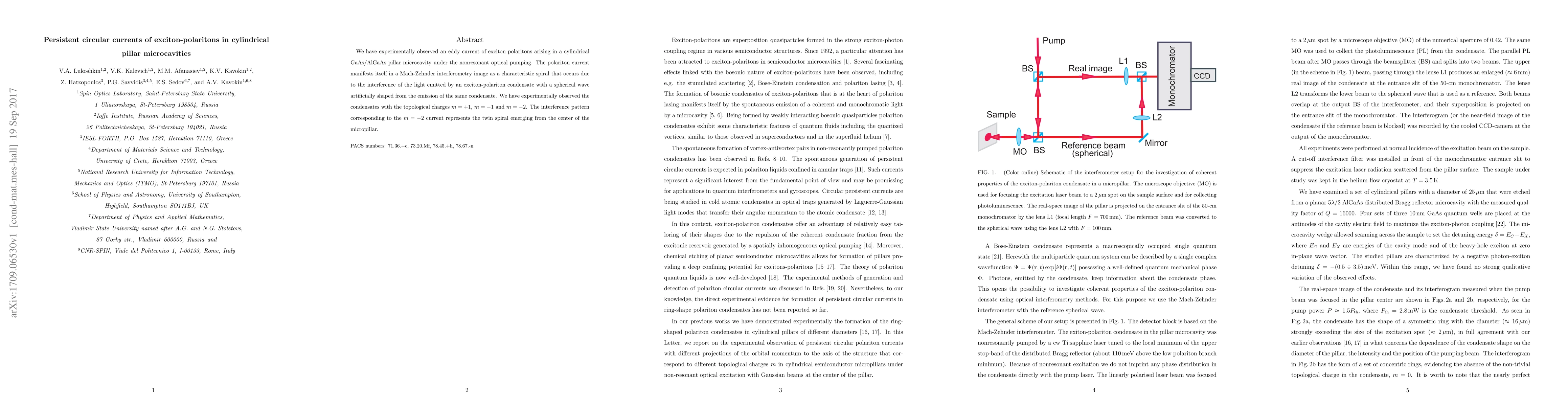 This research experimentally observes persistent circular currents of exciton-polaritons in cylindrical pillar microcavities, revealing spiral patterns via Mach-Zehnder interferometry. The study identifies topological charges with m = +1, m = -1, and m = -2, with the m = -2 current forming a twin spiral from the micropillar's center.