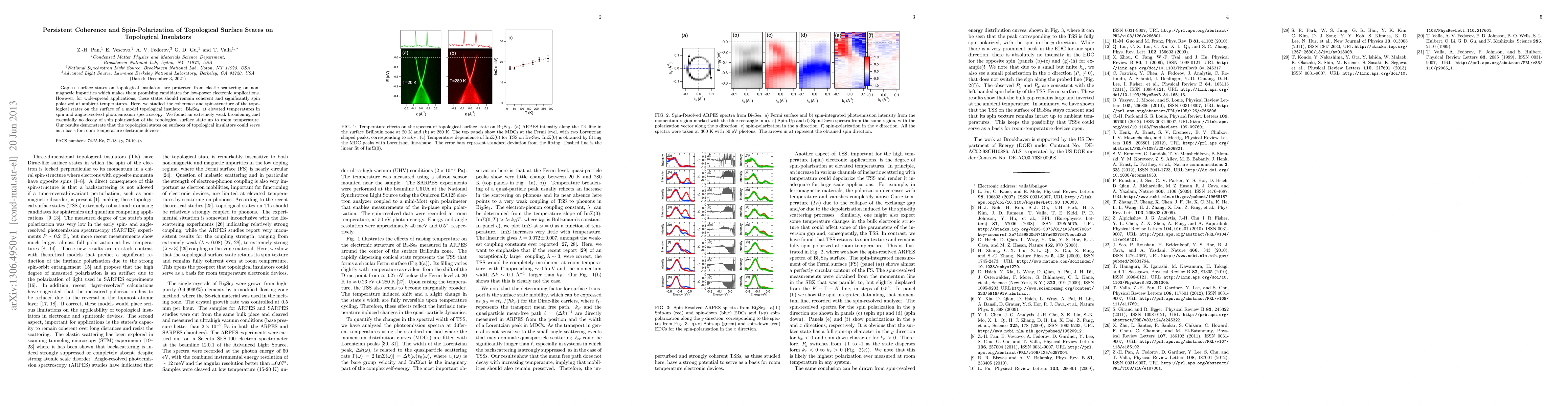 This study investigates the coherence and spin-polarization of topological surface states on Bi2Se3 at elevated temperatures using spin and angle-resolved photoemission spectroscopy. The findings reveal minimal broadening and persistent spin polarization up to room temperature, indicating potential for low-power electronic applications at ambient conditions.