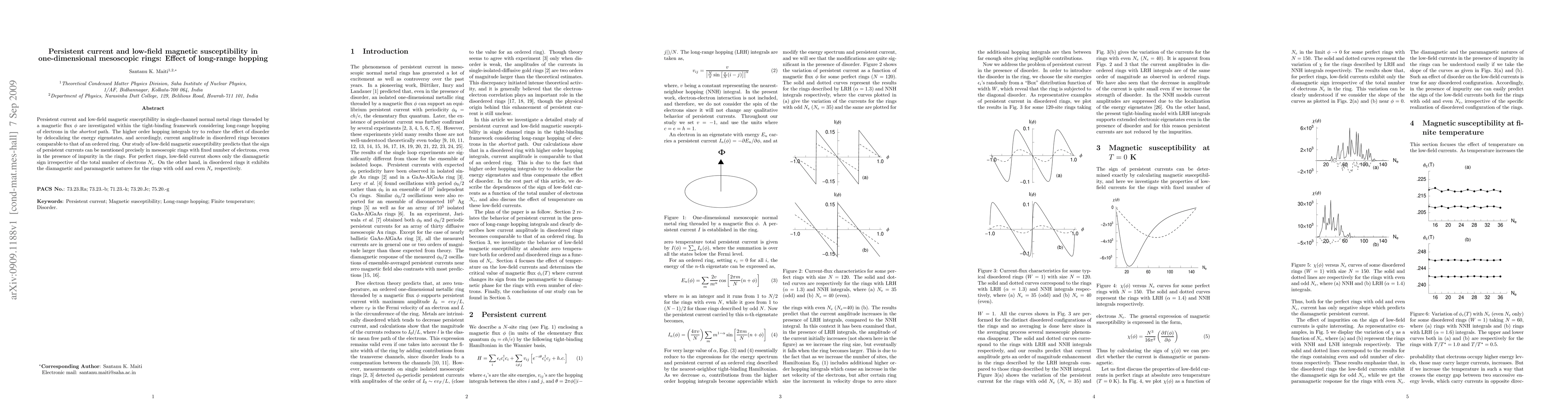 This paper investigates persistent current and low-field magnetic susceptibility in one-dimensional mesoscopic rings with long-range electron hopping, finding that higher order hopping can equalize current amplitudes in disordered and ordered rings. It also predicts that persistent current signs can be precisely determined in mesoscopic rings, showing diamagnetic behavior for perfect rings and both diamagnetic and paramagnetic behaviors for disordered rings depending on the electron count.