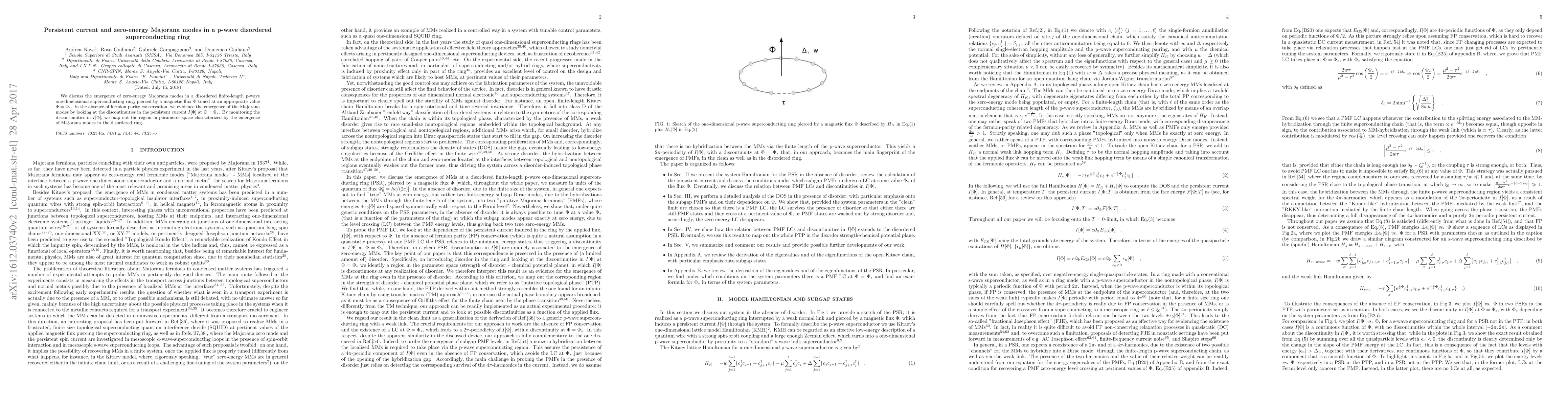 This paper investigates the occurrence of zero-energy Majorana modes in a disordered p-wave superconducting ring. The authors identify these modes through discontinuities in the persistent current, thereby mapping the parameter space where such modes emerge.
